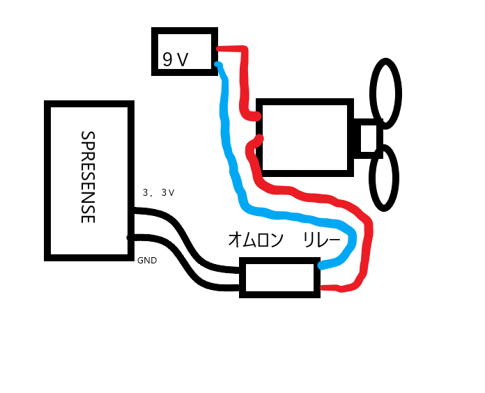 SPRESENSEの電源をつなげるとリレーが動作しモーターが回ります。