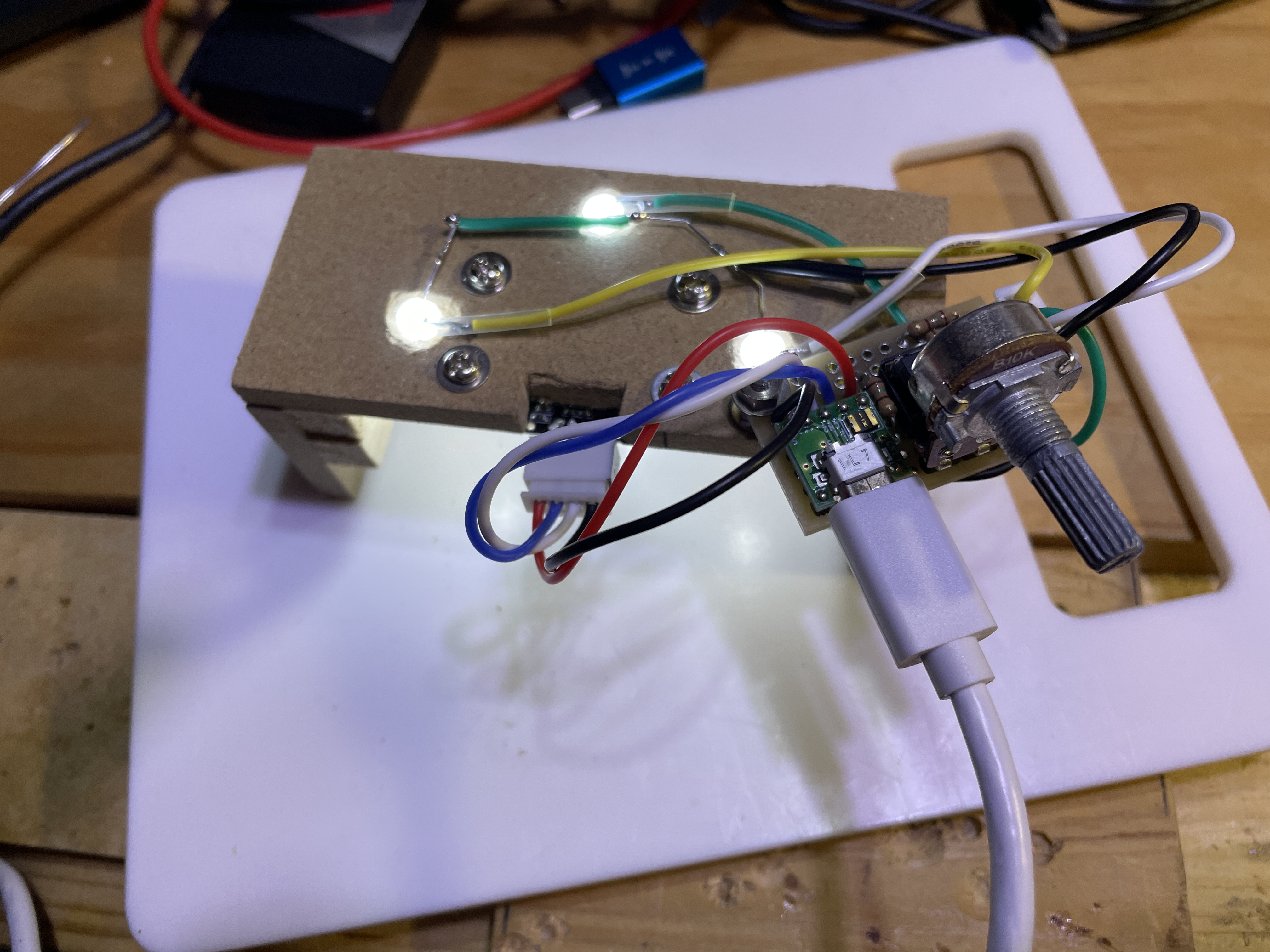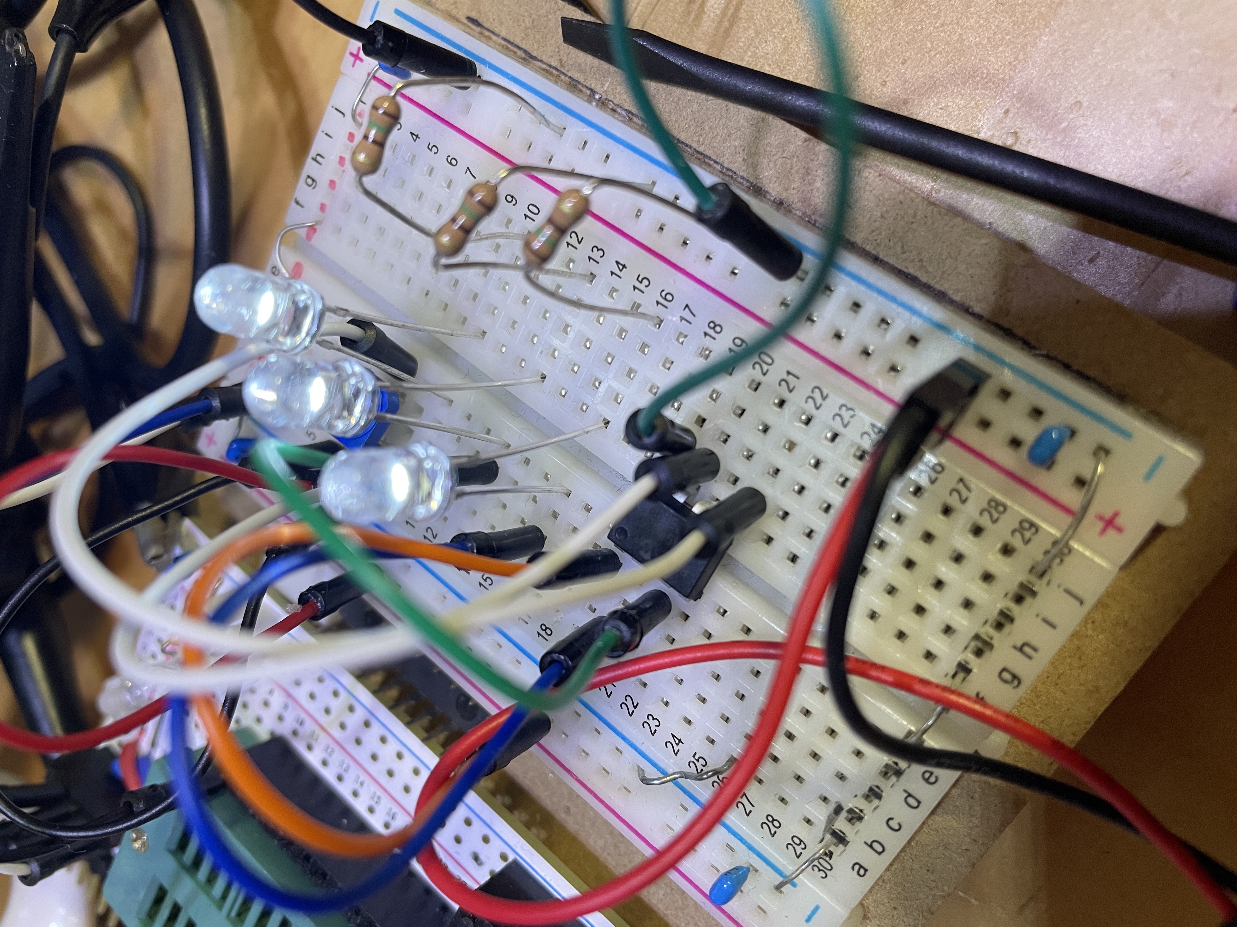 ブレッドボード上に組んてみて、ボリュームを上げたり下げたりすると明るさが変化することが確認できた。よくできました。