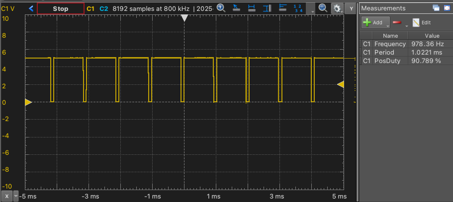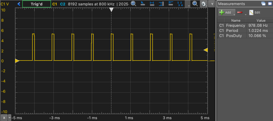 なお冒頭の図の通りPWM周波数は約1kHzである。LED点灯制御では問題ないが、直流モータ等の制御の際には音が聞こえてしまう可能性が高い。