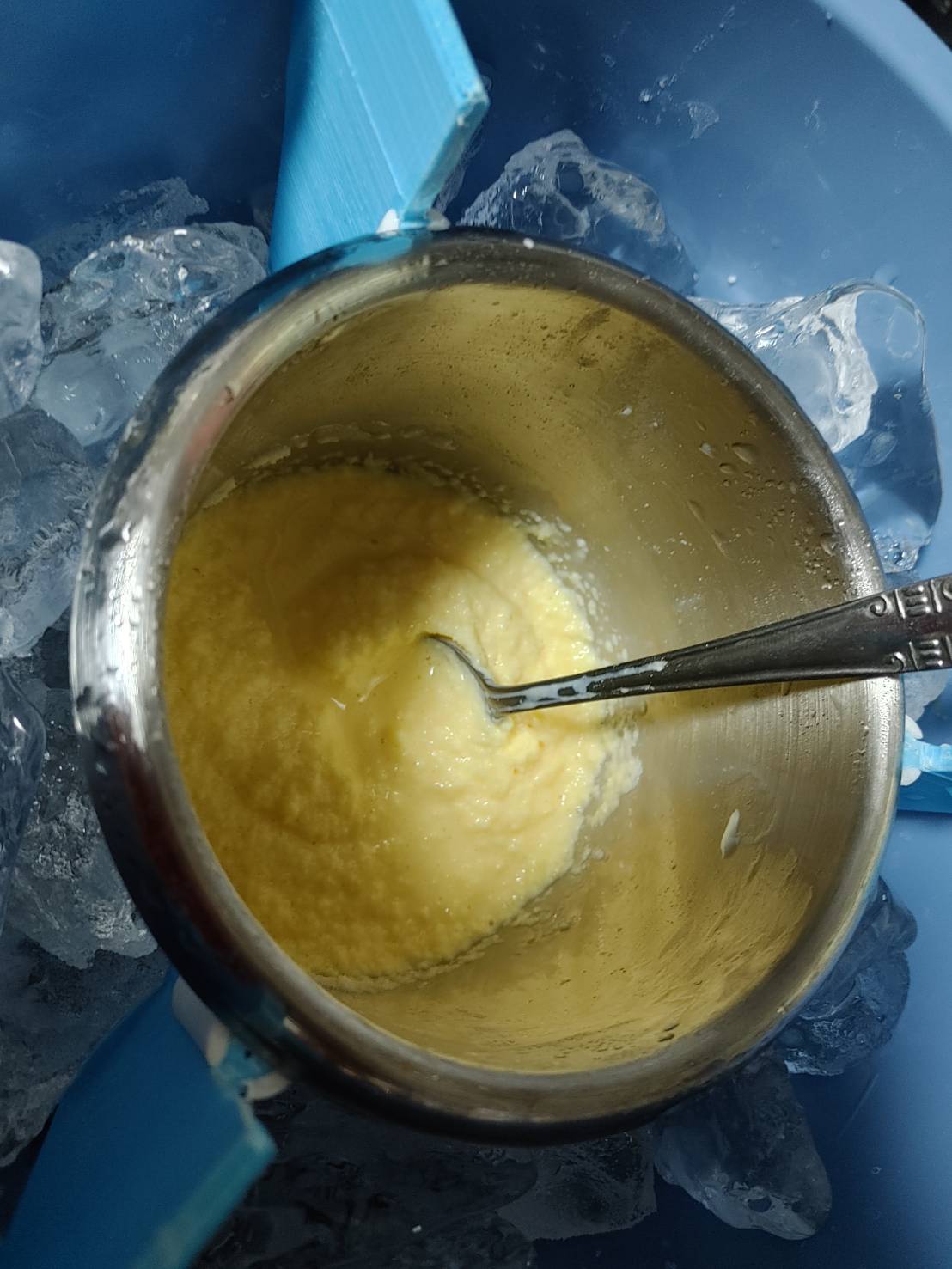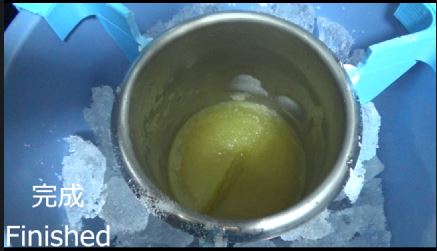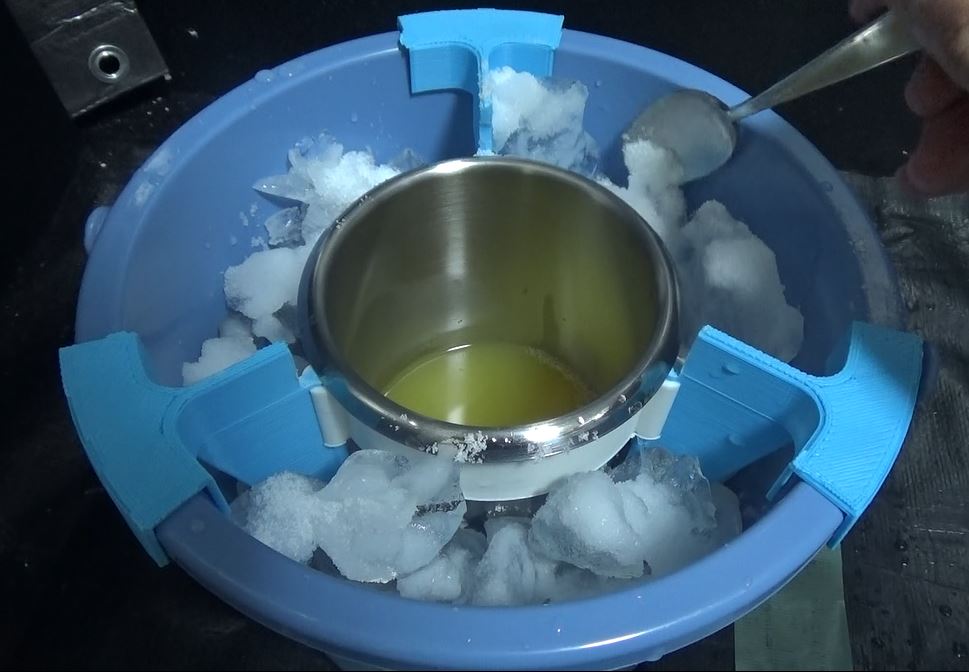 冷やし方は、固定治具、容器とバケツの間に氷と塩を入れます