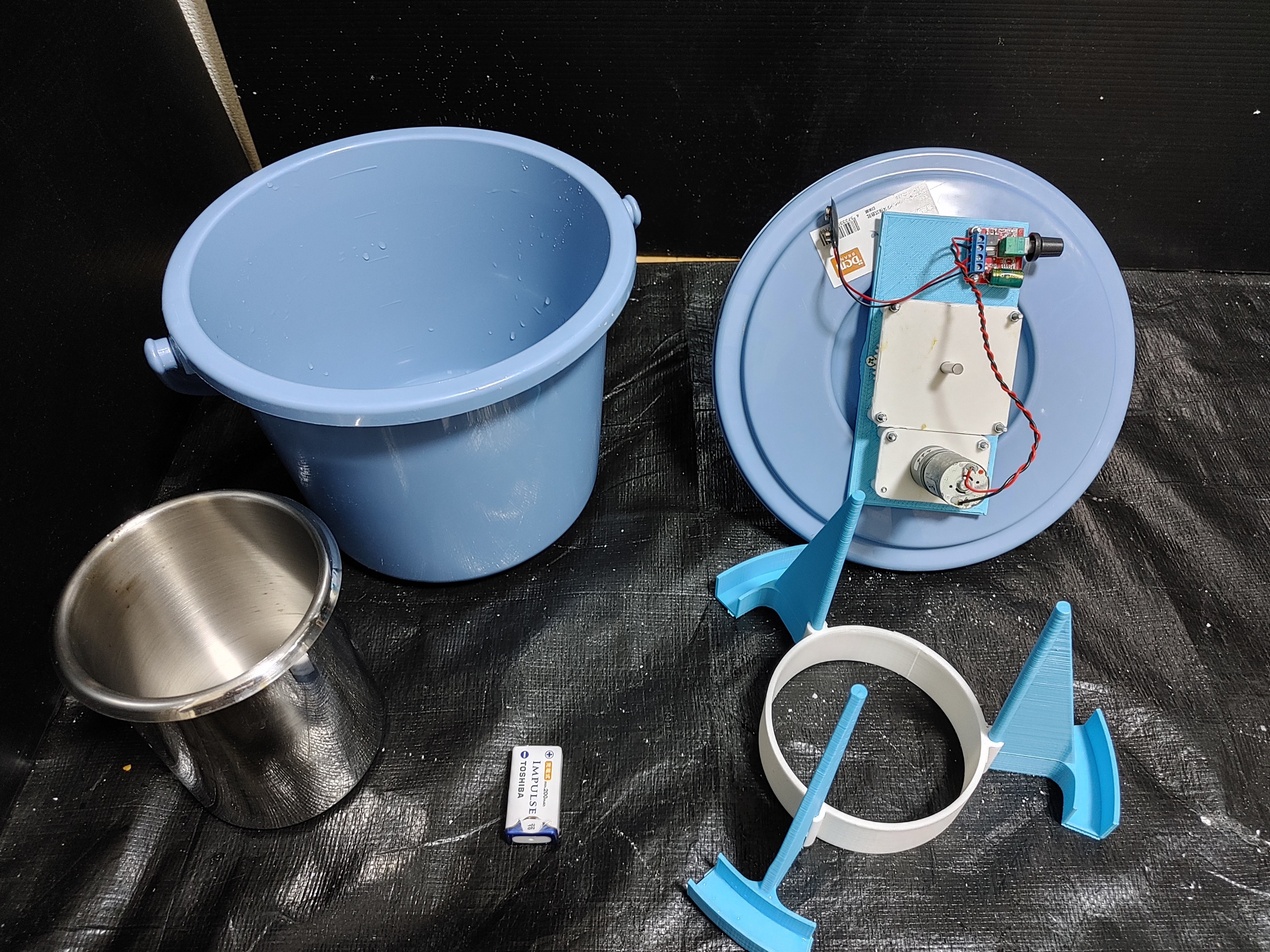 ①ホームセンターにある蓋つきバケツに穴加工を施して