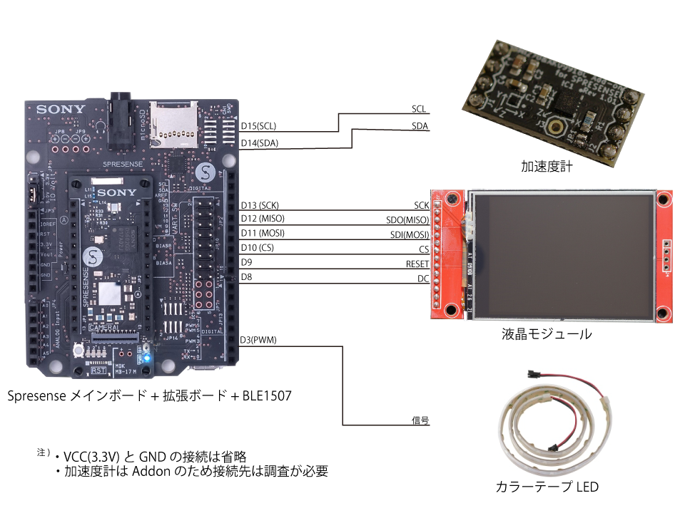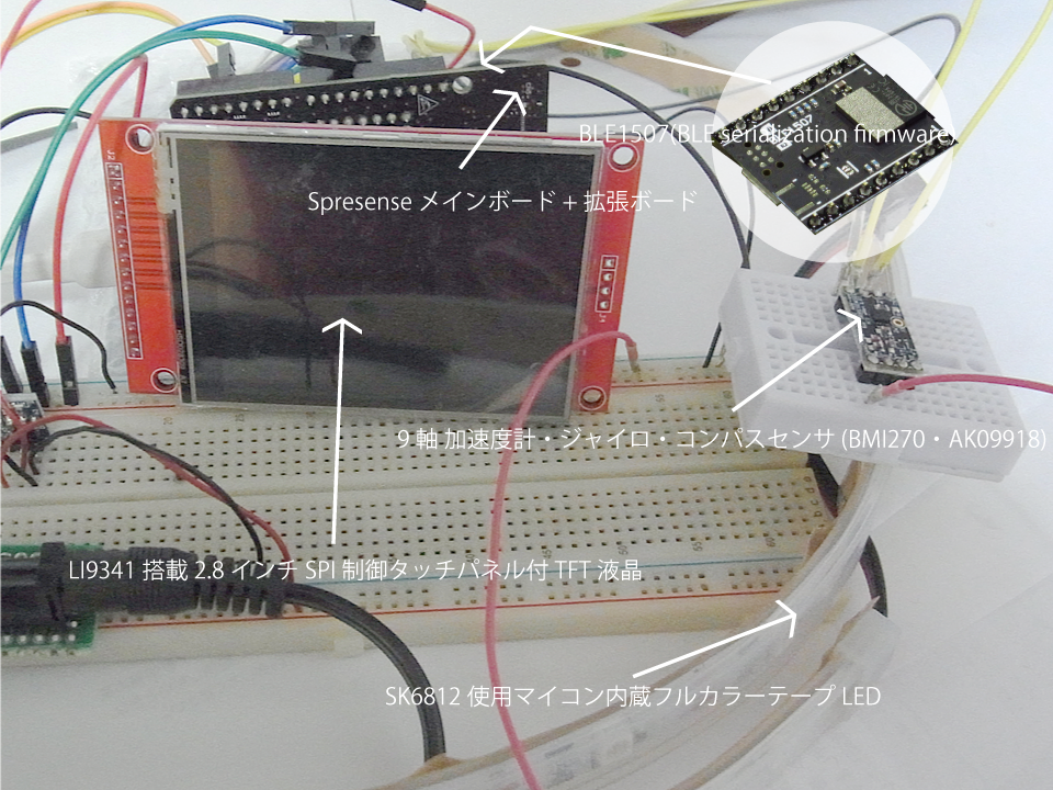 Spresenseメインボードに BLE1507(BLE serialization firmware) をAddonし、Spresenseメインボードと接続したSpresense拡張ボードに、SPIインタフェースを持つ液晶モジュール、I2Cインタフェースを持つ9軸 加速度計・ジャイロ・コンパスセンサ (BMI270・AK09918) Addon ボード、PWMにより接続するSK6812使用マイコン内蔵フルカラーテープLED 1m 30LED IP67をそれぞれ次のように接続します。