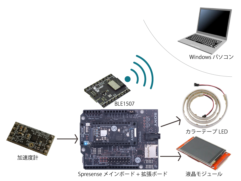液晶モジュールの背面からSpresense拡張ボードにSPIインタフェースにより接続します。Spresense拡張ボードに接続された加速度計が動くと、そのデータ値を液晶モジュールに表示し、同時にBLEによりWindowsパソコン上で動作しているブラウザに表示します。また加速度計の動きによって、カラーテープLEDの発行色が変化します。