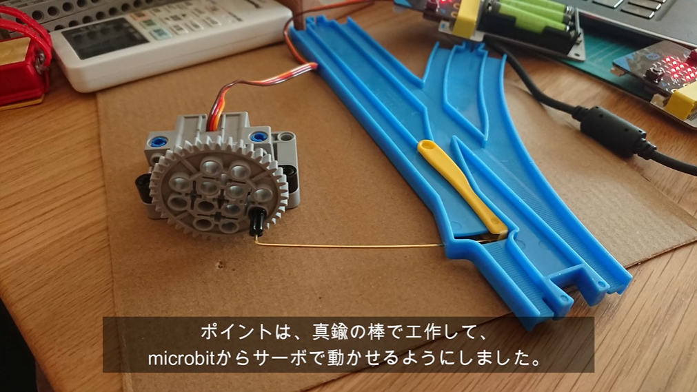 写真内では、歯車に付けた黒いコネクタパーツと、ポイントの側面にドリルで穴を開けてしんちゅうを通し、折り曲げて固定しています。ポイント側は、青いレールは貫通し、黄色いレールに引っ掛けています。