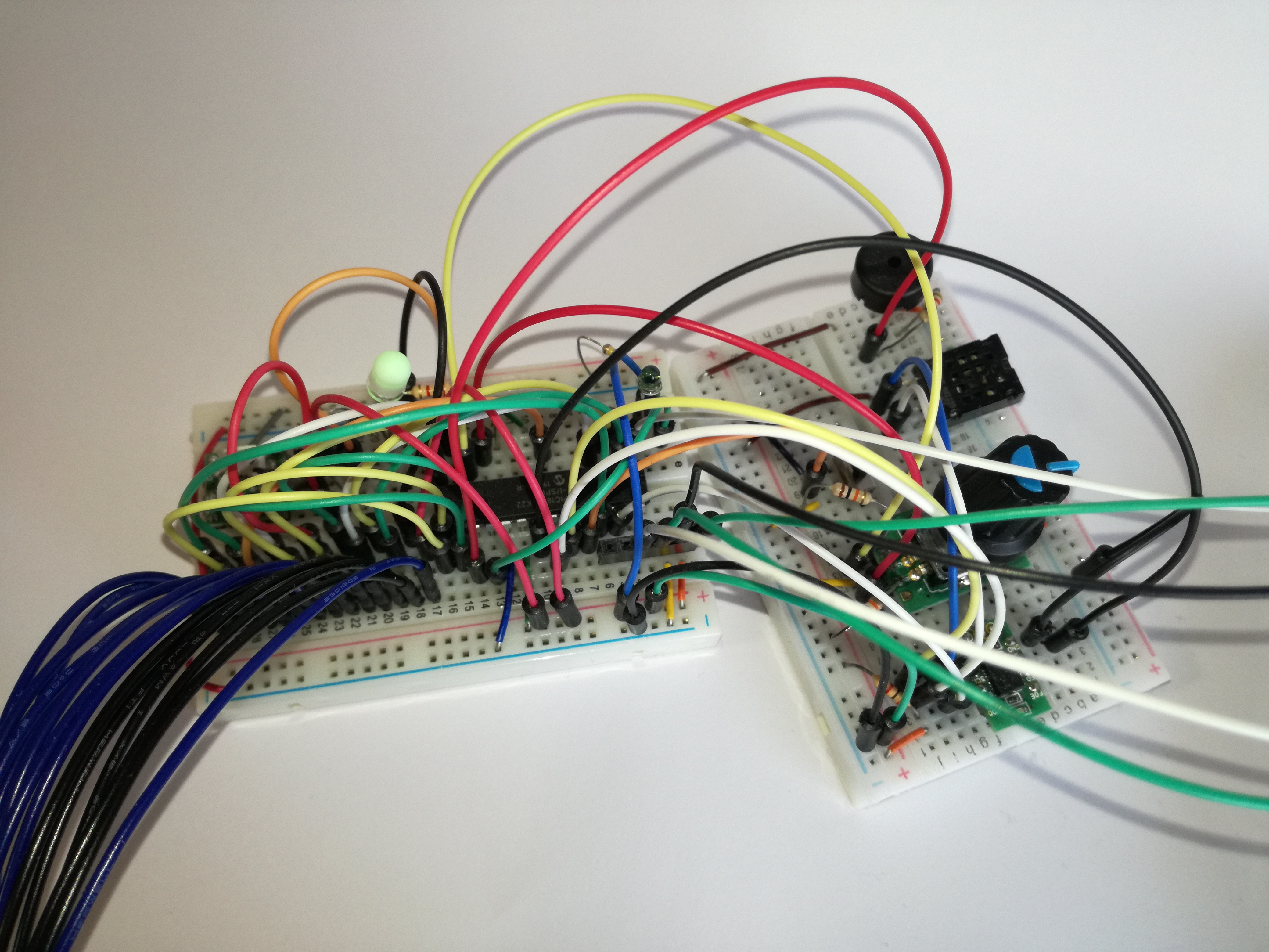1枚のブレッドボードに乗りきらなかったので、2つに分かれています。配線が多すぎてどう配線されているかわかりにくいかもしれませんので、少し説明します。