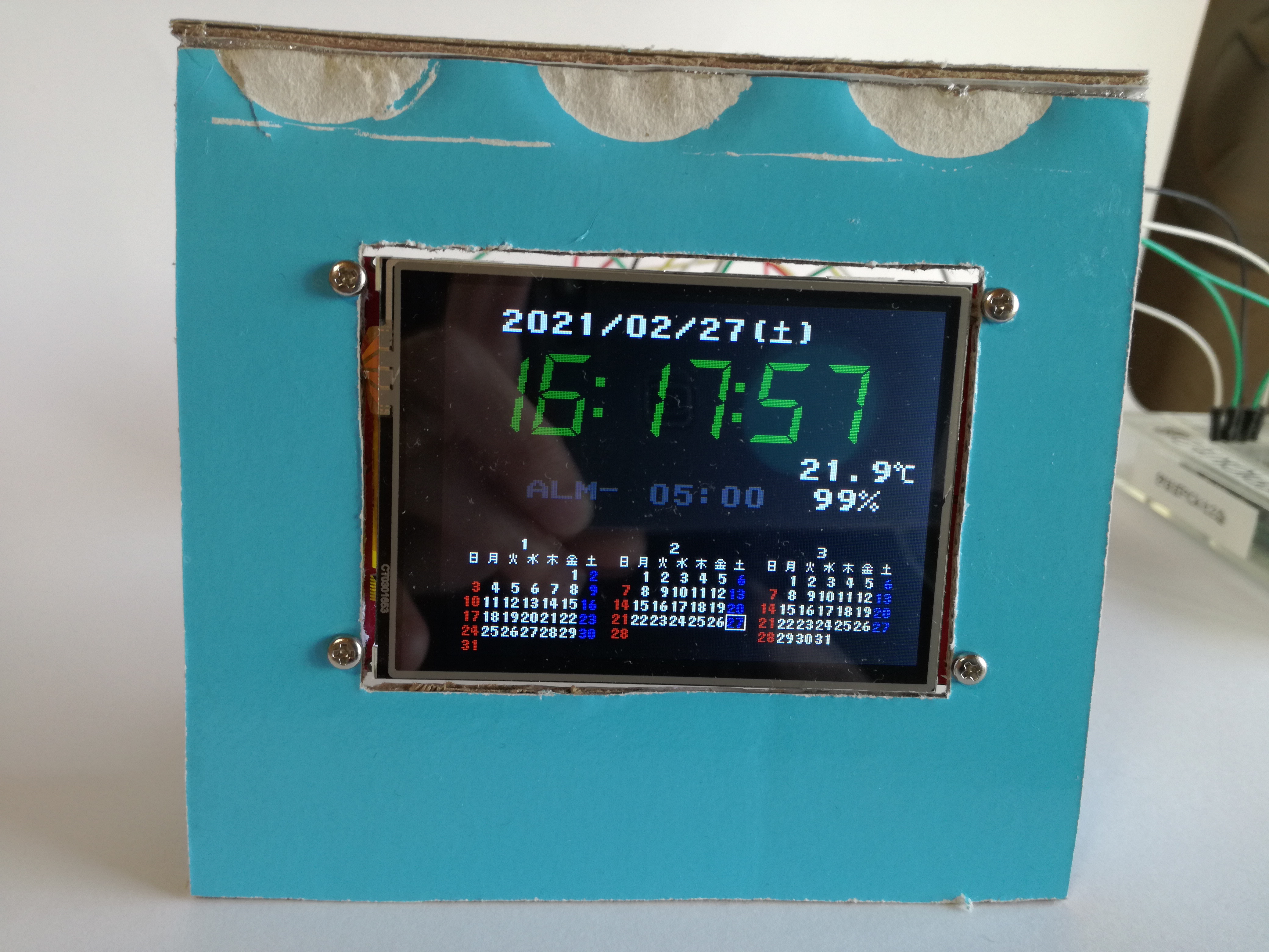 ケースはアクリル板とかで製作したいと思っていますが、まだチャレンジできていません。その辺にあった段ボールで作ったものなので、少し見栄えがよろしくありませんが、意外としっかりしています。LCDは、きちんとネジで止めてあります。