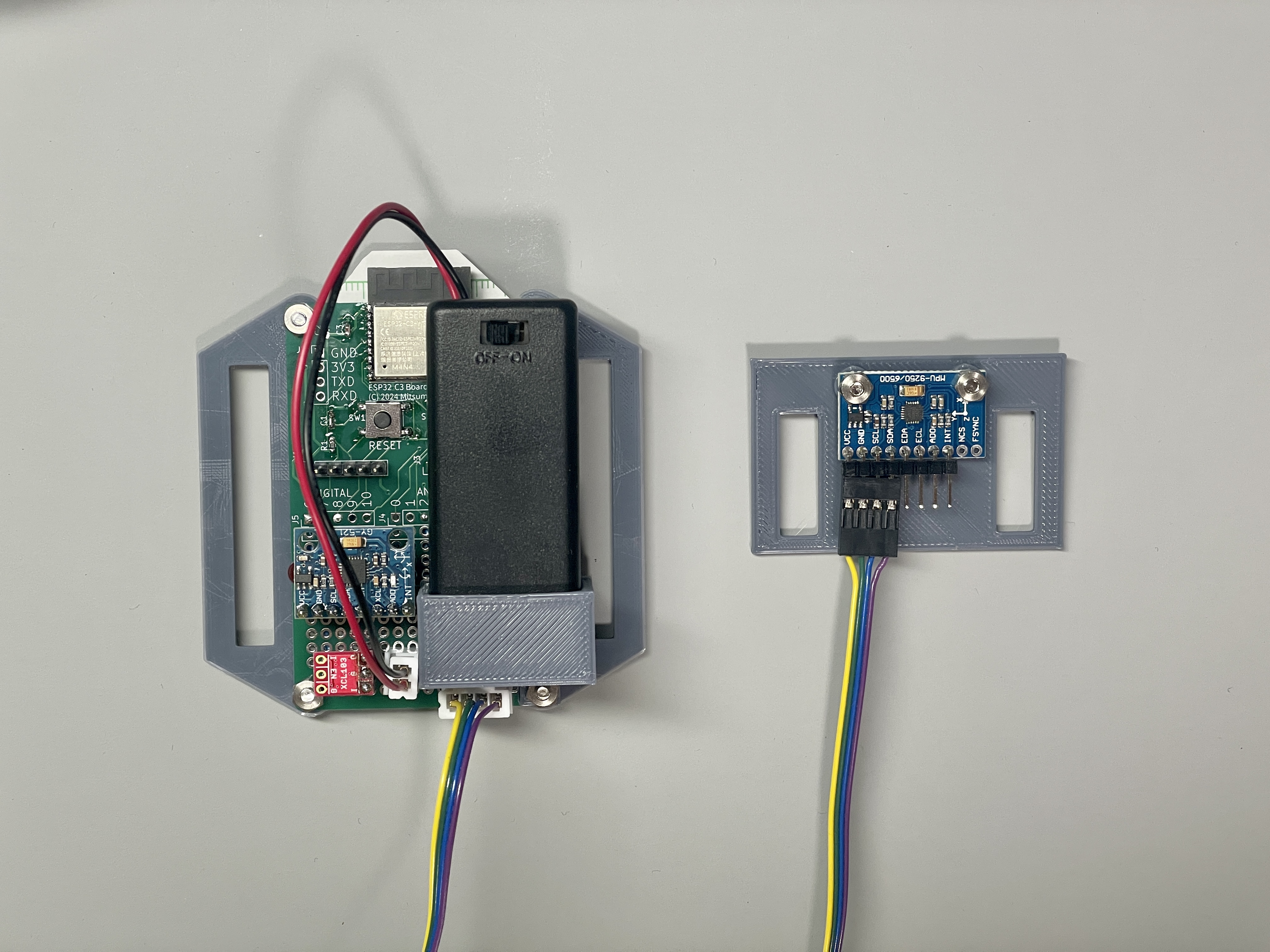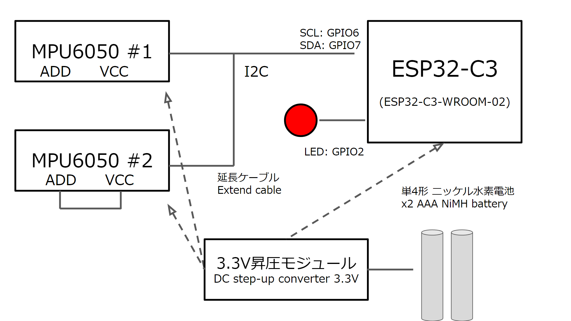 ESP32-C3をマイコンとして、MPU6050を2つ接続、電源はニッケル水素充電池 2本です。