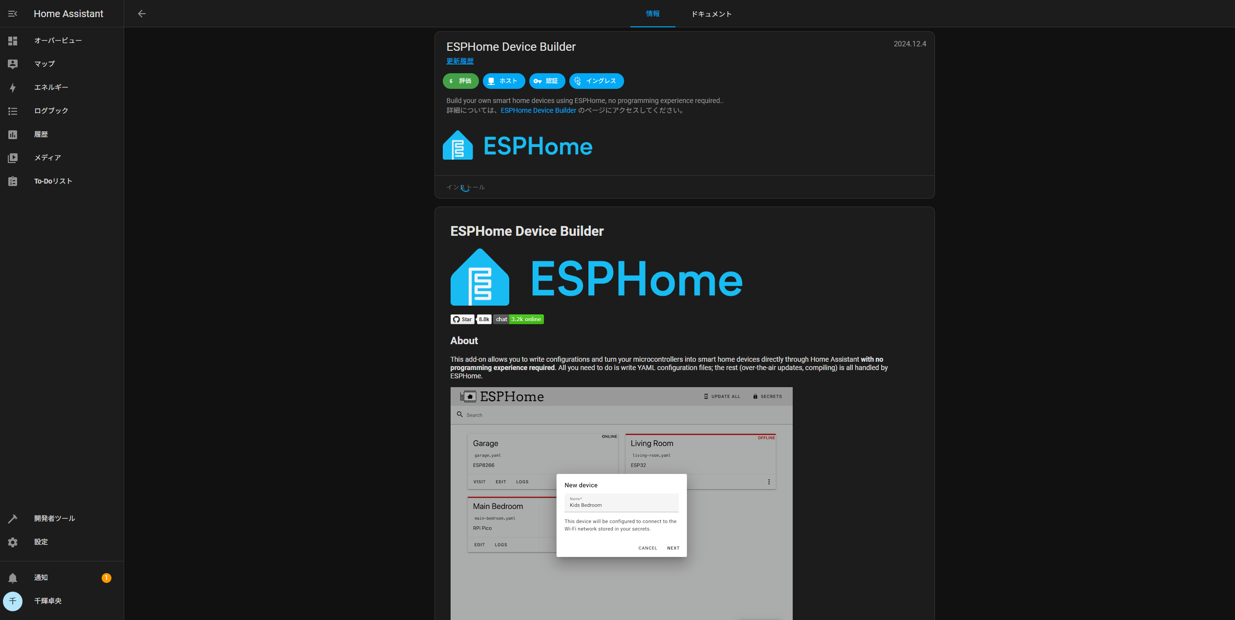 設定→アドオン→「ESPHome」で検索します。ヒットしたものをインストールすれば自動的に使えるようになります。よく使用する人はサイドバーに表示も有効にすると楽になります。