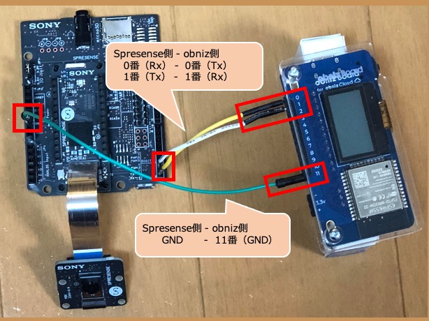 今回の構成では、Spresense と obniz のそれぞれが USB から電源をとっています。そのため、2台のデバイス間のシリアル通信を行う部分で、接続する必要があるのは「Tx、Rx、GND」のみです。