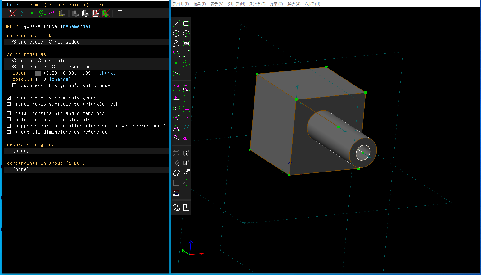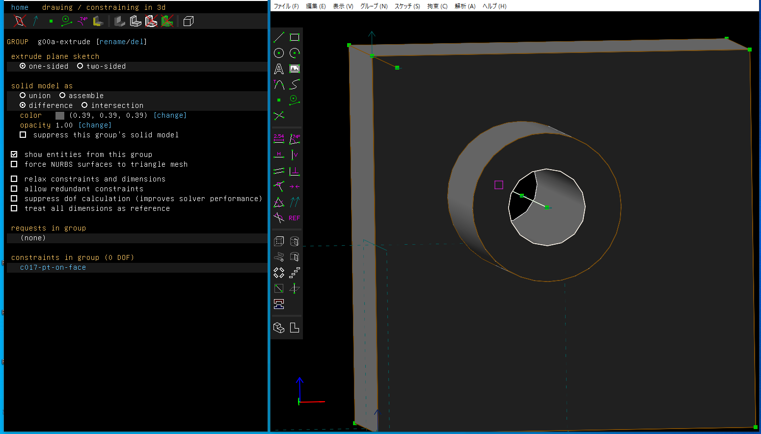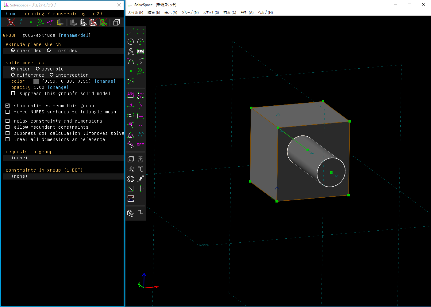 - 3D CAD SolveSpace入門 (2) : 作業平面を指定してスケッチ、押し出し、切り取り(この記事)