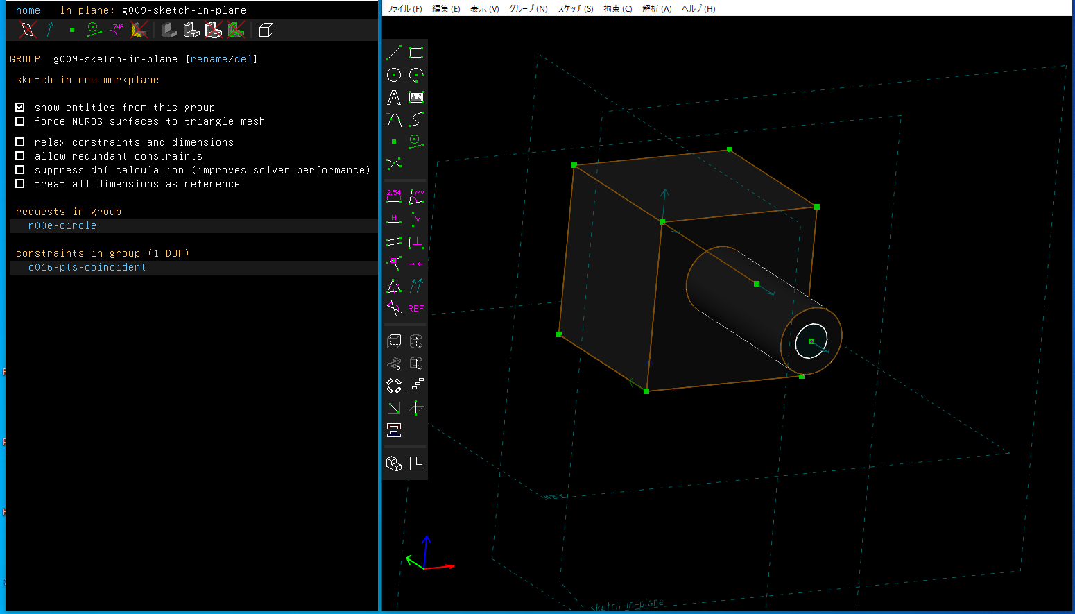 切り取る量の指定は、通常の押し出しと同じように拘束を使って指定します。たとえば、面と点を選択して一致拘束をすると、点を面の上に拘束できます。