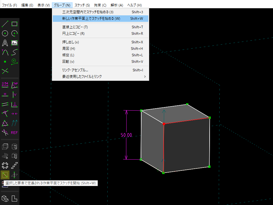 直方体の手前の面を作業平面として作業を開始します。したいのですが、Fusion360のように「面をクリックしてスケッチ開始」という操作が(今のところ)できません。