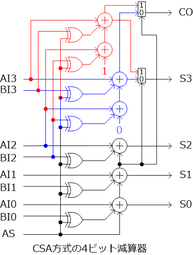 この加減算器の高速化について考えてみましょう。もっとも多くの素子を通過する経路(最長パス)を図3の右側に赤線で示しました。この線が意味するのは、ASやBI0が変化してからS3やCOが確定するまでに5素子分の遅延があるということです。そこでこの経路を短くする方法を紹介します。