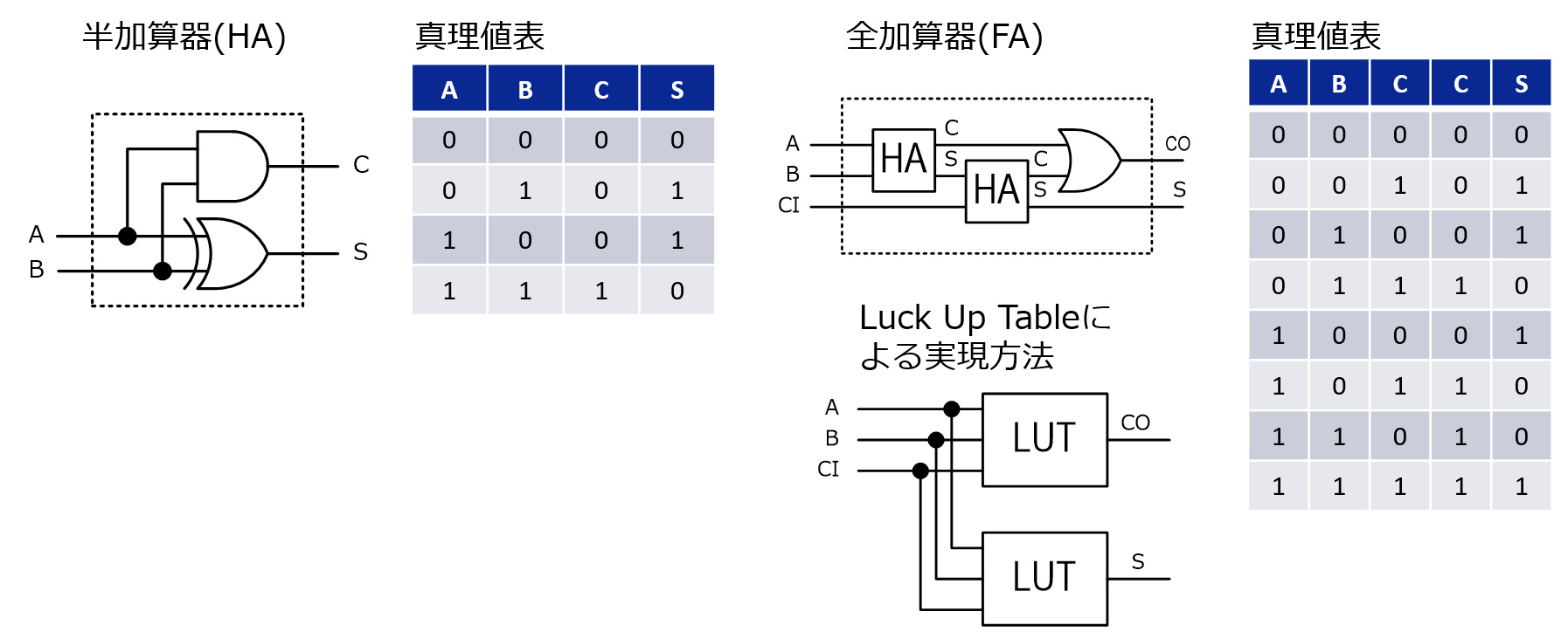 2つの1ビットの信号を加算する回路を半加算器、桁上がり信号も足す回路を全加算器と呼びます。半加算器は、ANDとXORで作ることが出来ます。全加算器は、半加算器2個とORで作ることが出来ます。GreenPAKでは、3入力のLUT(Look Up Table) 2個で構成できます。