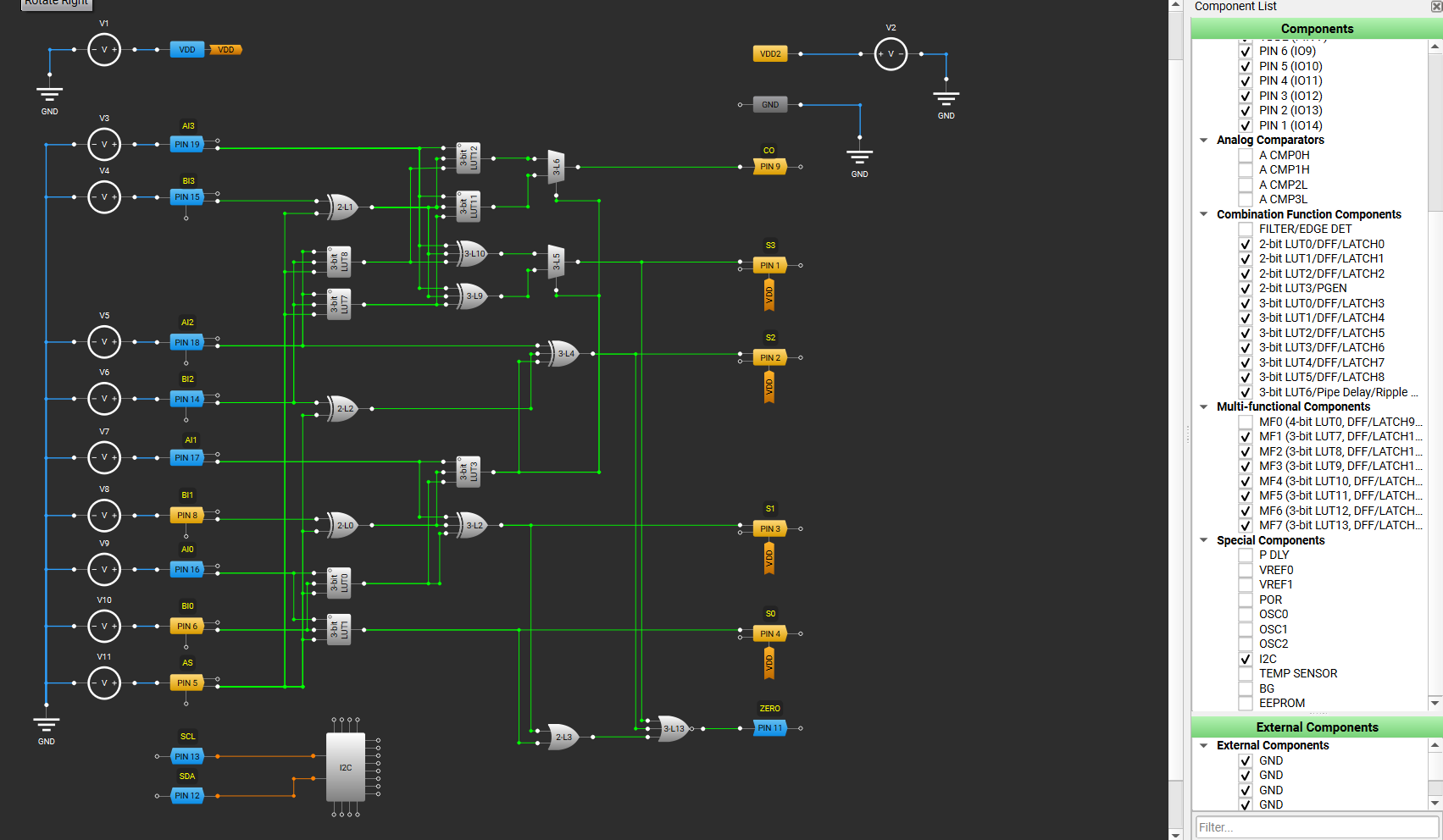 SLG46826 1個には、4ビットのALUしか入りませんでした。マイコンを作るには複数個必要ですね。また、動作速度もそれほど高速ではありません。GreenPAKで演算回路を作る際の動作速度のご参考になれば幸いです。