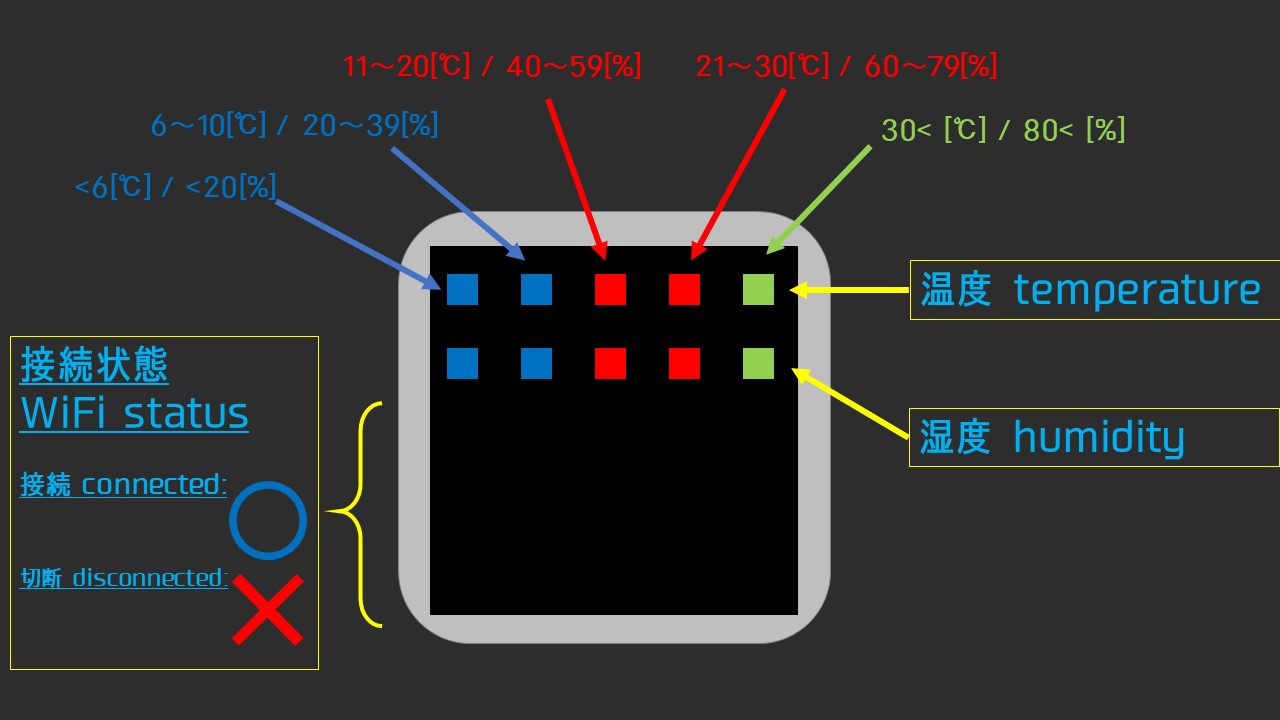 表示には数字を使わず、色と場所で気温と湿度を表現しています。実際の動作動画はこちらから。きれいですね。