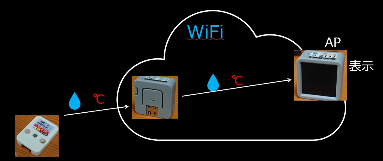 構成はこのようになっています。ENV.2のSHT3XとATOM LiteがIICで通信、気温と湿度を取得します。その後、WiFiのAPとして起動してあるATOM Matrixに接続し、UDP通信で気温と湿度をMatrixに送信、表示します。