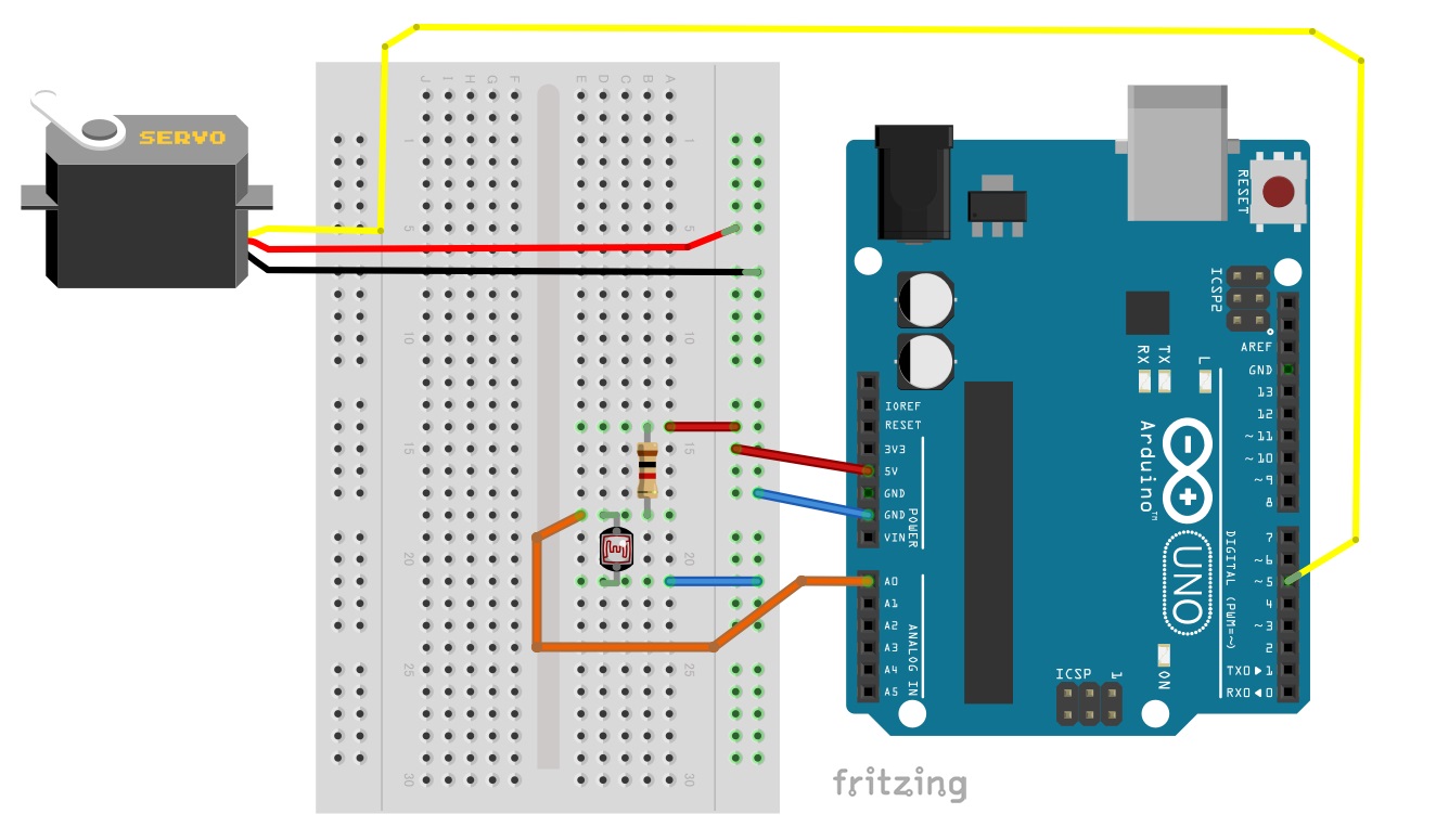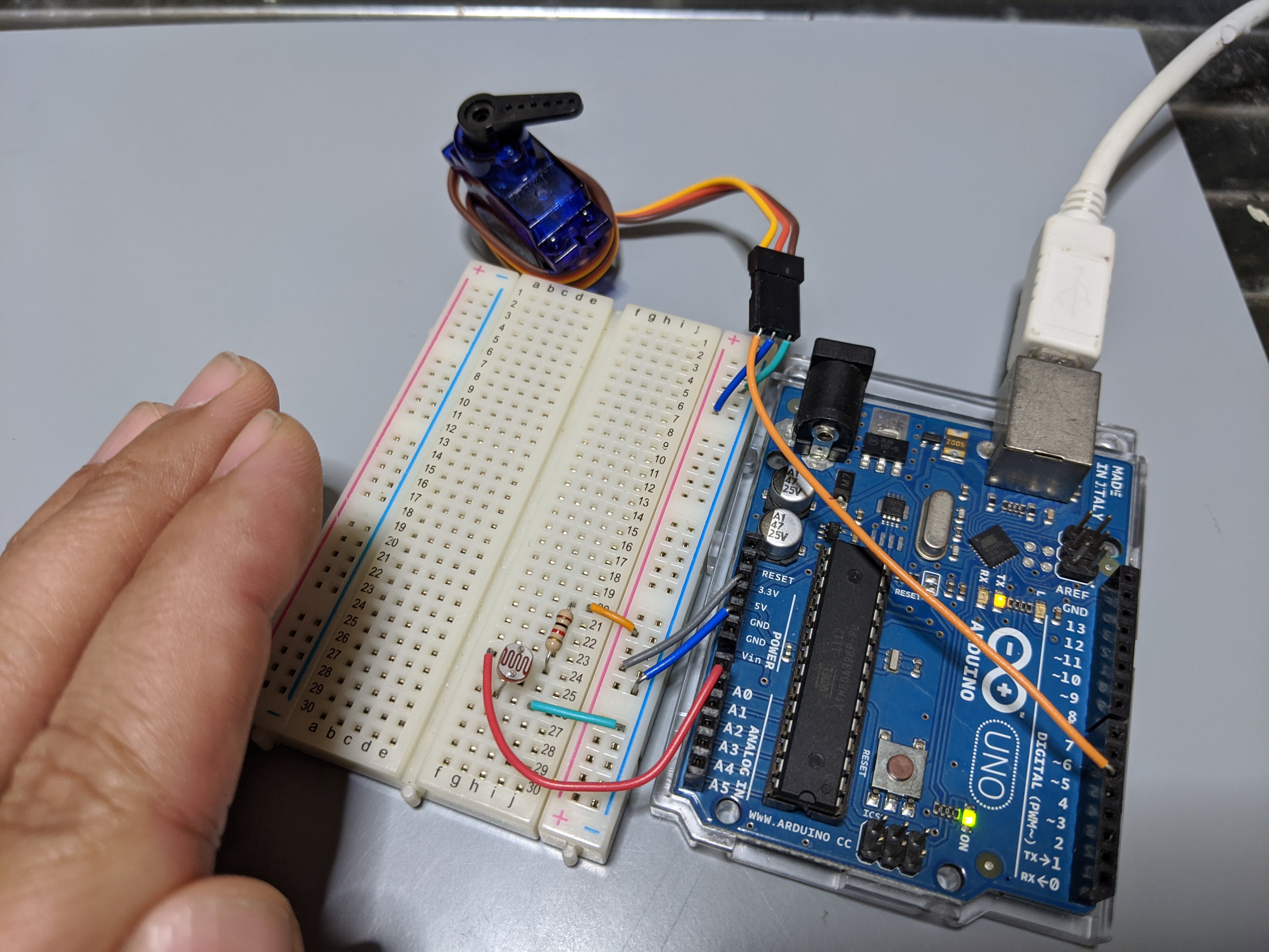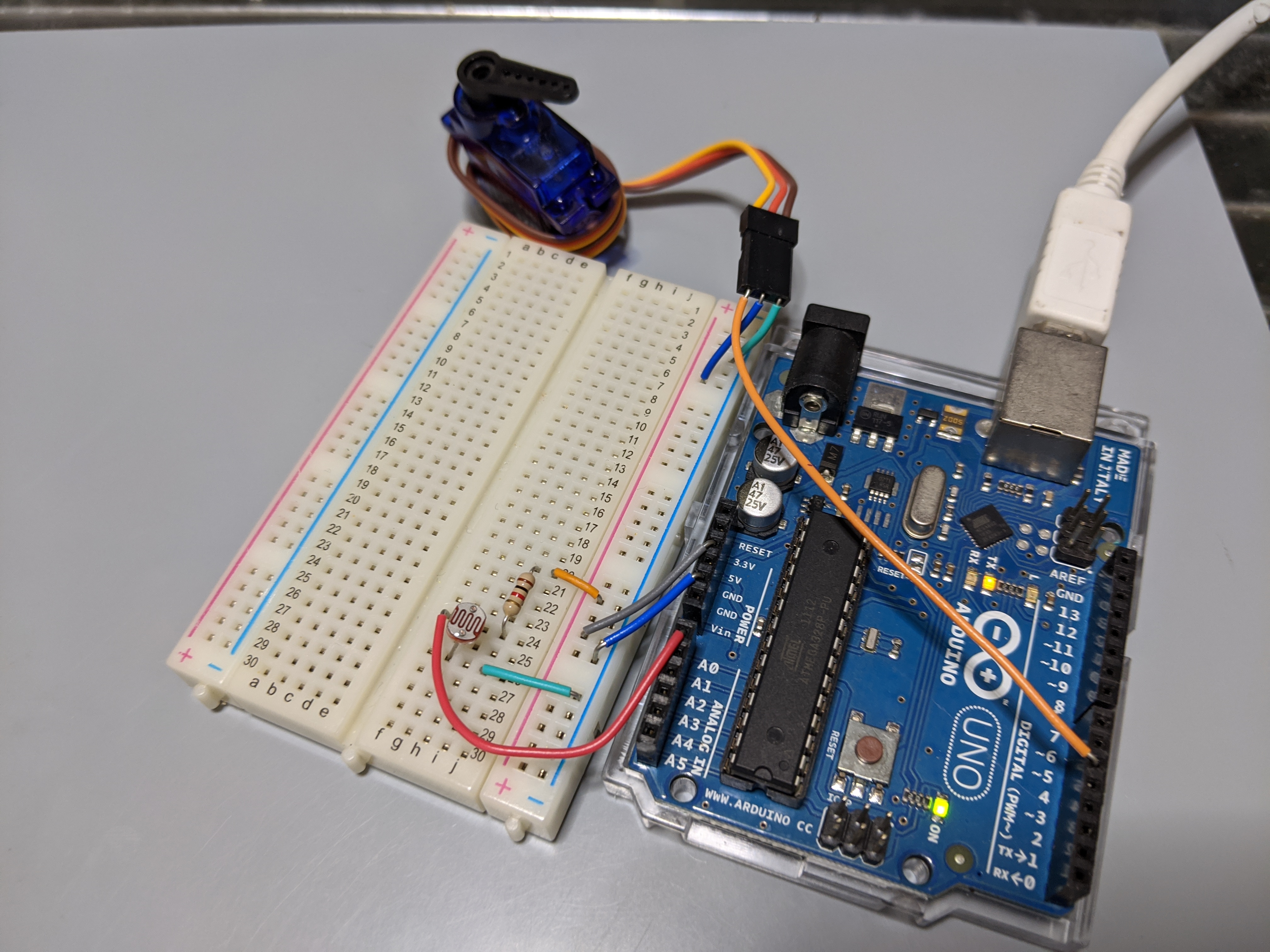 それでは、以前テストした光センサーを追加して、読み取った明るさをサーボモーターの傾きで示すプログラムを書いてみたいと思います。