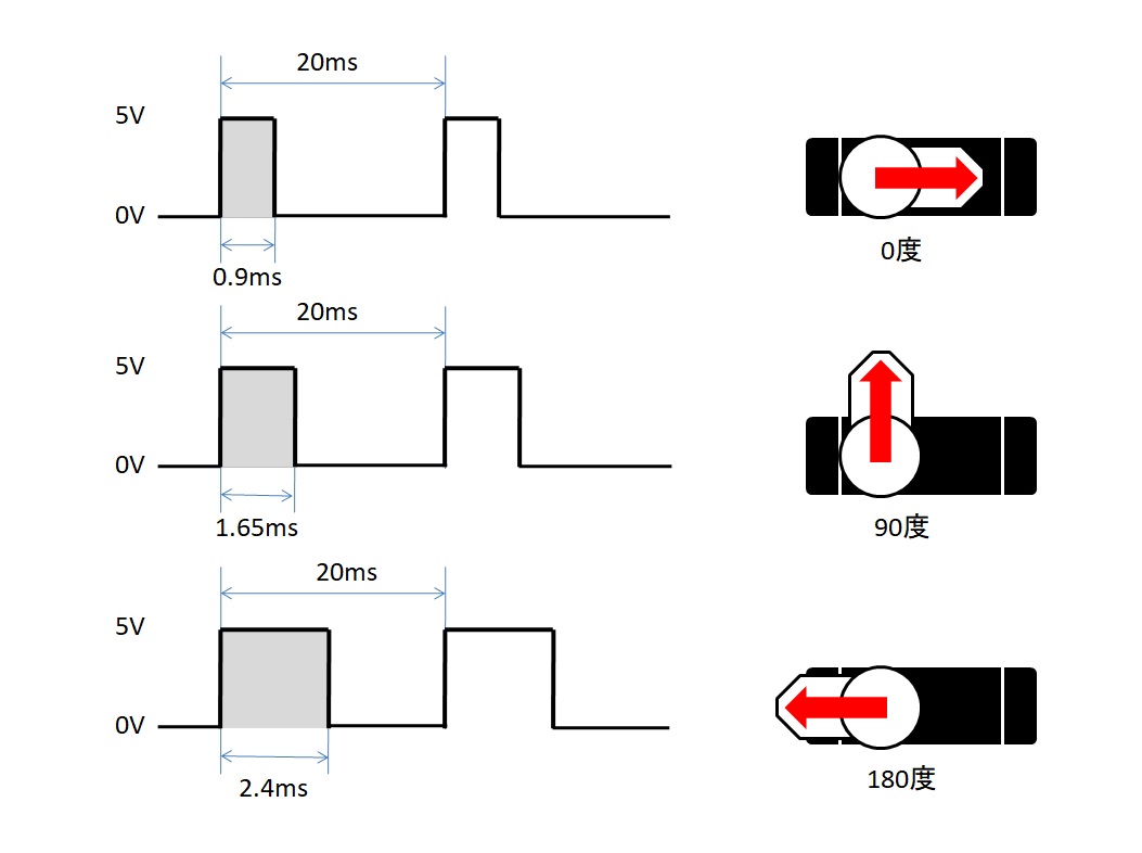 また、いちばん右端を0度、信号の長さが長くなる毎に反時計回りに回転して行き左端180度まで信号を送る事が出来ますが、不用意な力が外からサーボモーターに加わっても制御不能になる事がない様、通常の製品では20度から160度くらいまでの範囲で動作する様に制御して使用する事をお勧めします。