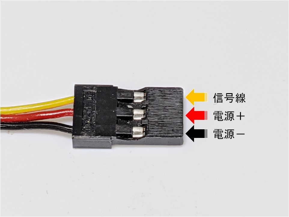 サーボモーターからは3本の電線がひとまとめになってコネクタがついているケーブルが出ています。その色は各社様々なのですが、基本的なルールとして