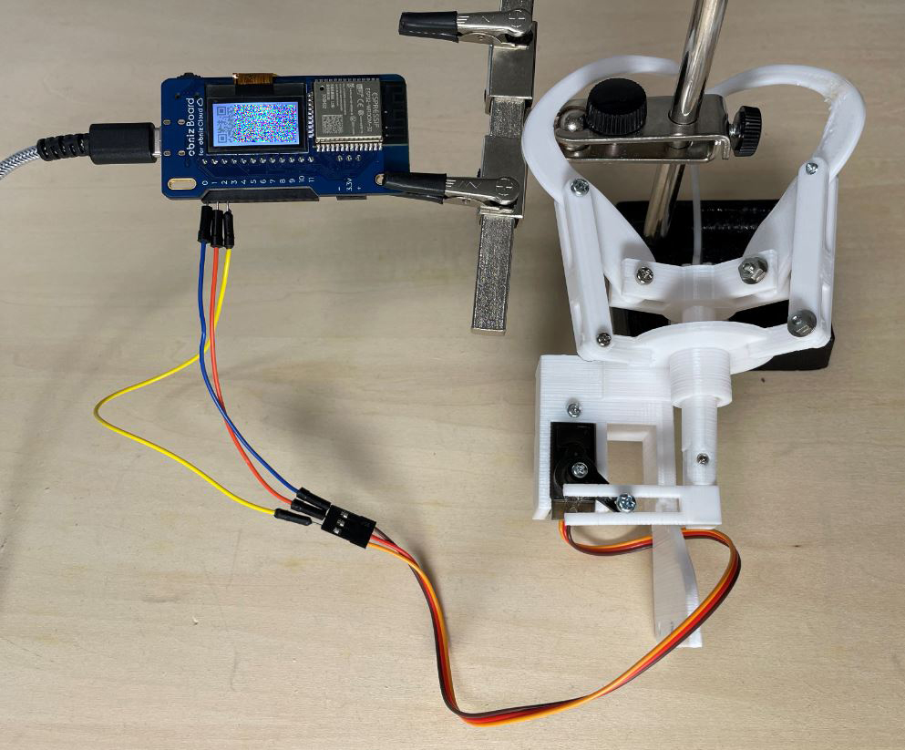 Obniz では PWM 機能の他にサーボモーター専用の機能が用意されており、角度を指定するだけでモーター角が制御できます。とても簡単に実装できました。