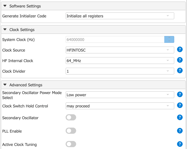 オシレータ種類は高速内部発振の「HFINTOSC」一択でいい。周波数の選択肢は「1、2、4、8、12、16、32、48、64」とかなり幅広いし、PLLが無いので何かの組み合わせを考慮する必要もない。今回はお試しで無駄に最高速にしてみた。
