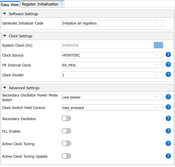 オシレータ種類は高速内部発振の「HFINTOSC」一択でいい。周波数の選択肢は「1、2、4、8、12、16、32、48、64」とかなり幅広いし、PLLが無いので何かの組み合わせを考慮する必要もない。今回はお試しで無駄に最高速にしてみた。