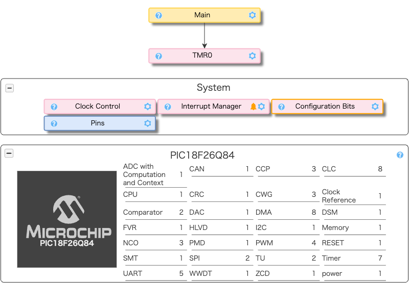 PIC18F26Q84はプログラムメモリが64KBあり、PIC 12F1822のように2KBの中に四苦八苦して収める必要がないので、無駄ルーチンを吐き出すMCC (GUIで設定したら半自動である程度のソースを書いてくれる)を使ってもメモリ不足になることは少ない。従ってMCCをバリバリ使うわけだが、PIC18向けのMCCには「Classic」と「Melody」の2種類がある。