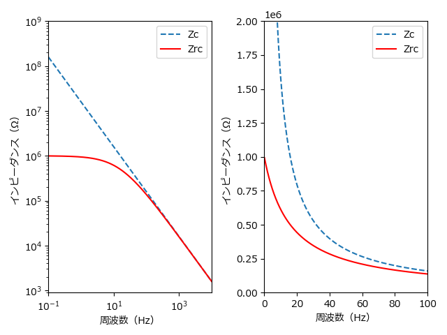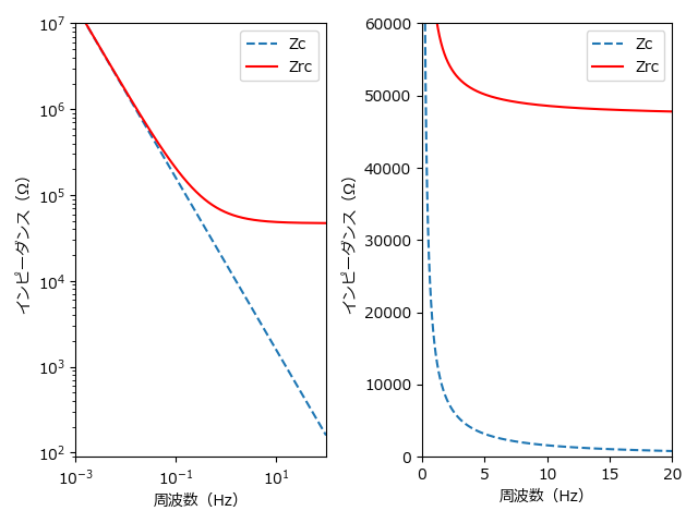 グラフの Zc は C3 によるインピーダンスを、Zrc は R3 と C3 による合成インピーダンスを表します。カットオフ周波数 0.34Hz 付近では Zc が十分に大きく(対数グラフの方で見ると 40MΩ 程度)、R3 が支配的であることが分かります。したがって近似 2 は妥当でしょう。