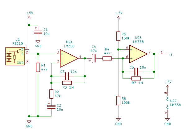 U2A の + 端子に入力される信号を v˙ とします。v˙ は焦電センサの出力なので、数 V 程度の直流信号に、振幅が数 mV ~数 10mV 程度の交流信号が重畳されたものだと考えられます。