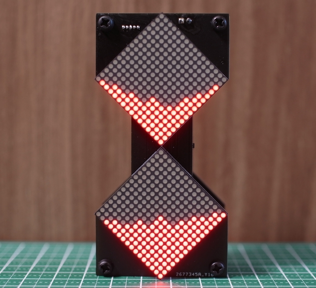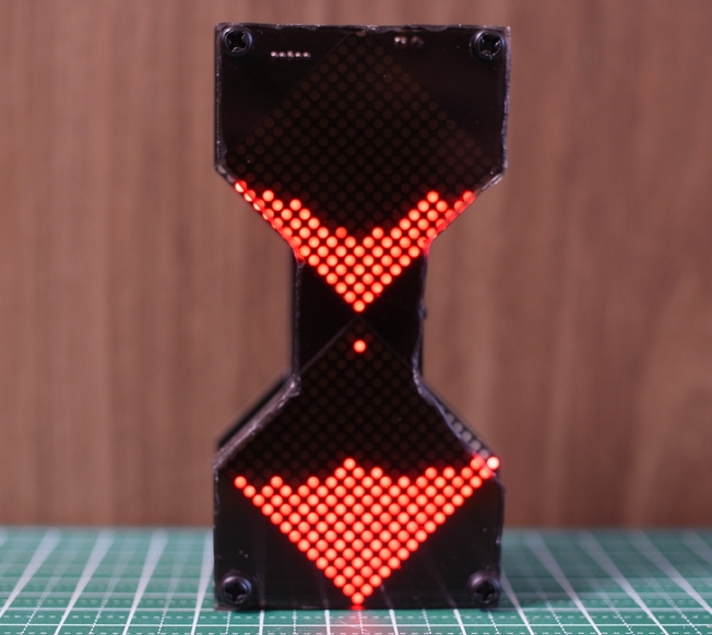 砂に見立てたLEDは1秒に1つ落ちるようになっており、リセットスイッチを押すと重力とは反対側のLED MATRIXに180個が集まります。