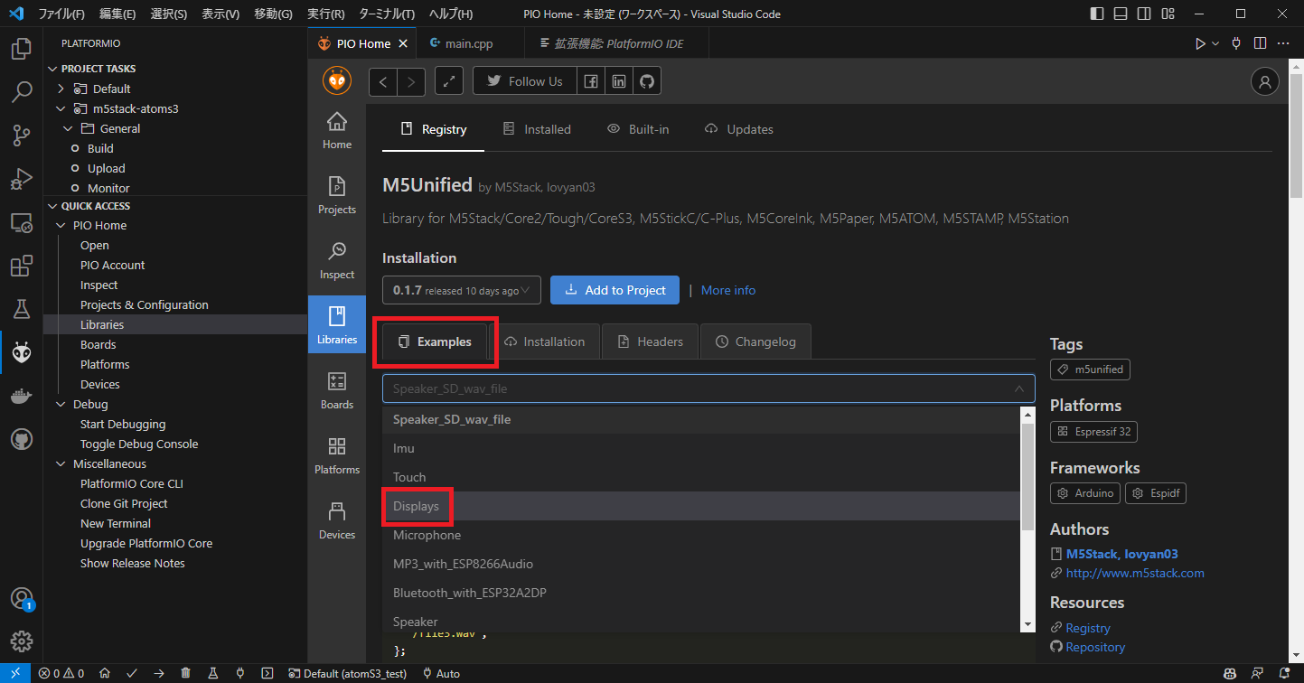 M5Unifiedを選択した画面の「Examples」tabでサンプルコードが確認できます。