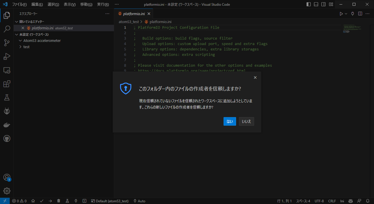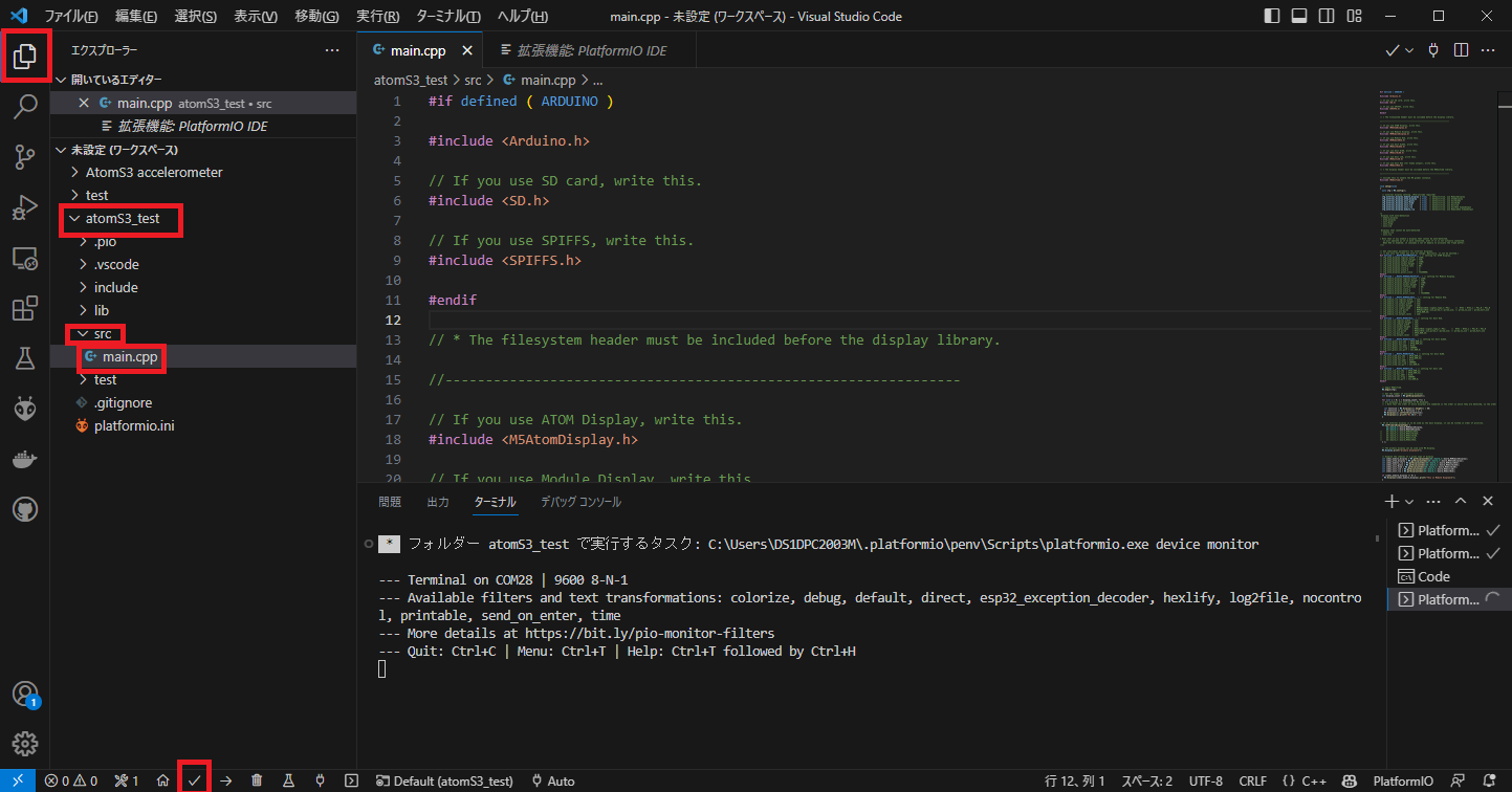 以前にPlatformIOを使用したときには面倒な設定などがあって放り出した記憶があるのですが、今回はとくに詰まるところもなく導入まですすめました。