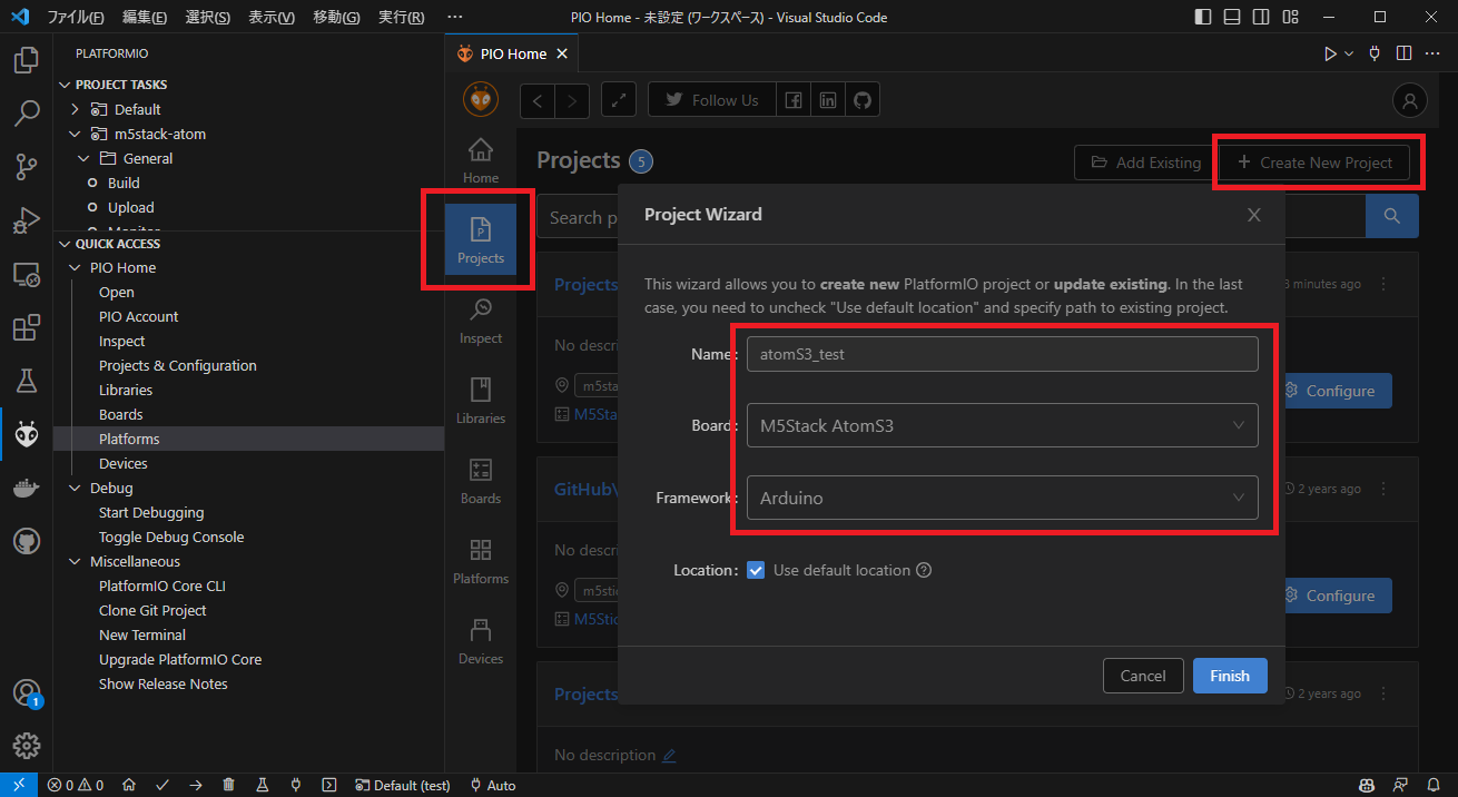 新規プロジェクトを開始するには、「projects」アイコンをクリックして 「+ /create New Project」を選択「Name」に任意のプロジェクト名を入力、「Board」では「M5Stack AtomS3」を選択、「Framework」には「Arduino」を選択して「Finish」します。