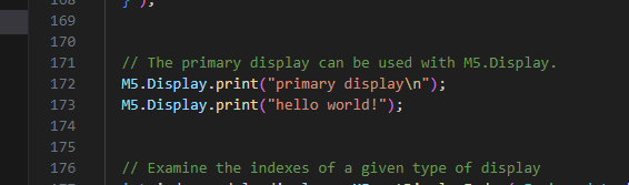 デモコードの172行目に、テキスト表示のコマンドが使われていますので、下の通り173行目にhello world の表示を追加します。