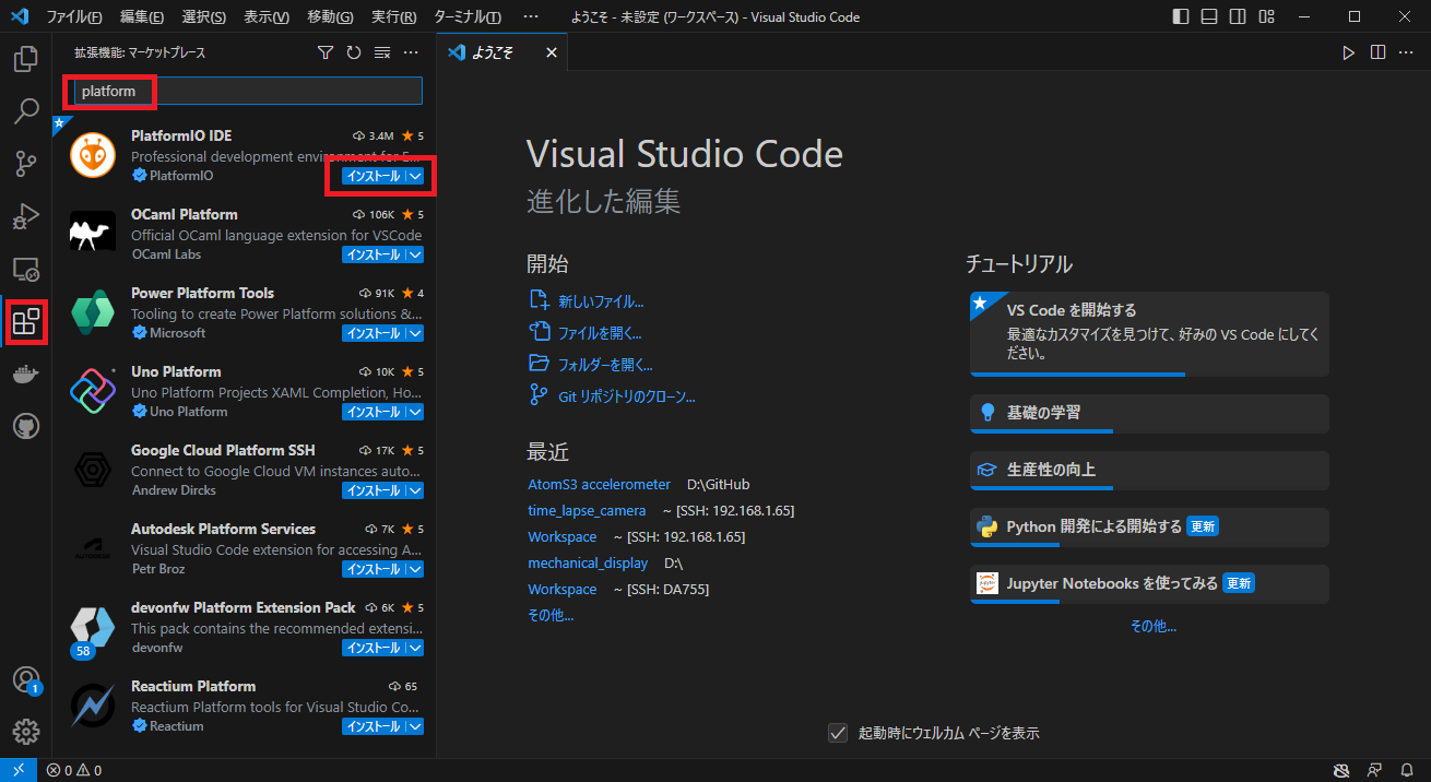 VSCodeを起動して、画面左の□が4つ重なったアイコンをクリックすると、拡張機能のマーケットプレースが開きます。検索窓に「platform」と入力するとPratformIO IDEが見つかるので「インストール」をクリックするとインストールできます。