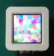 出来たら、ウィンドウ最下部の「→」アイコンをクリックするとコンパイルと書き込みをしてくれます。実行されると、認識されたディスプレイの表示が出た後に、グラフィック描画デモが始まります。