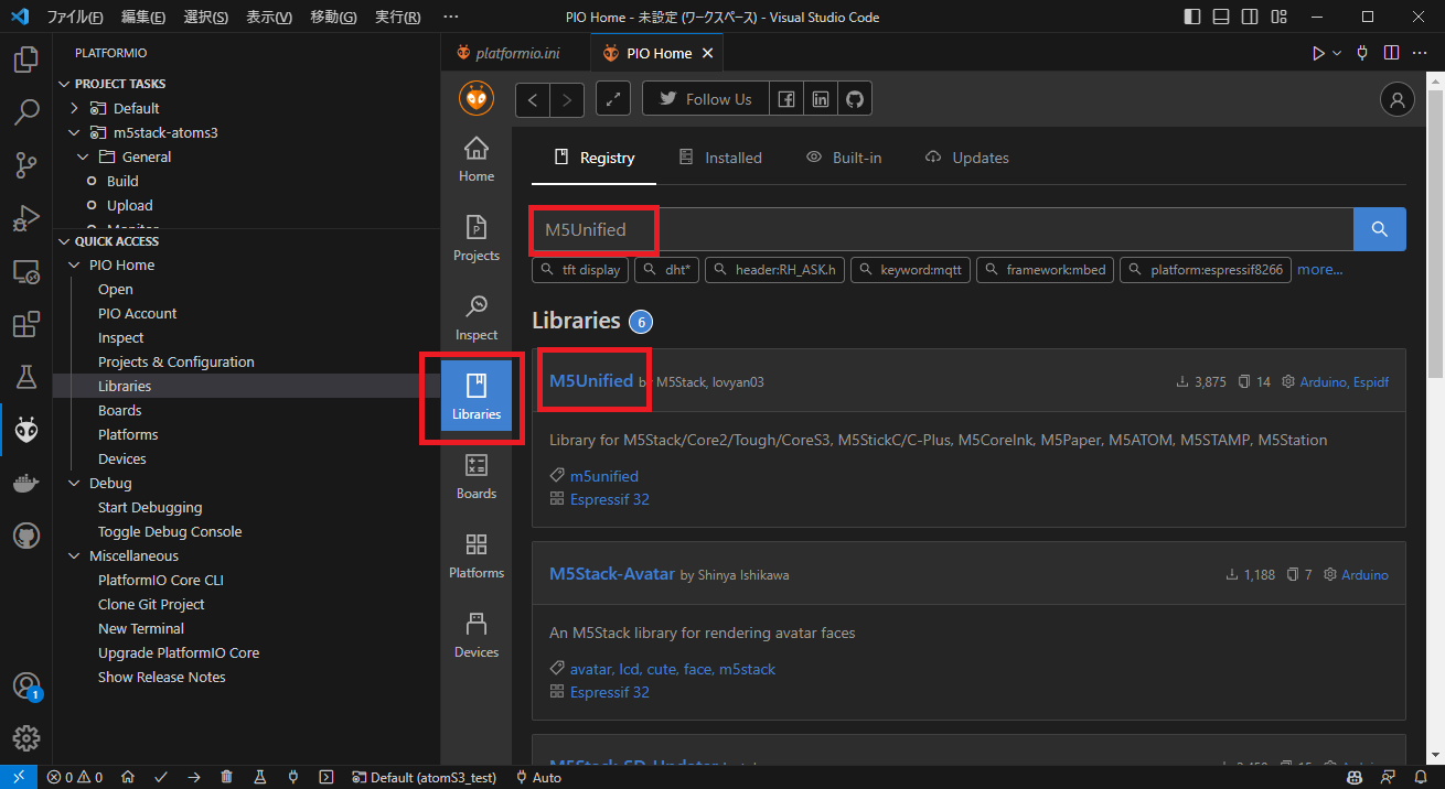 M5Unifiedのライブラリをインストールするには、「Libraries」アイコンをクリックし、検索窓で「M5Unified」を検索、ヒットした「M5Unified」をクリックします。