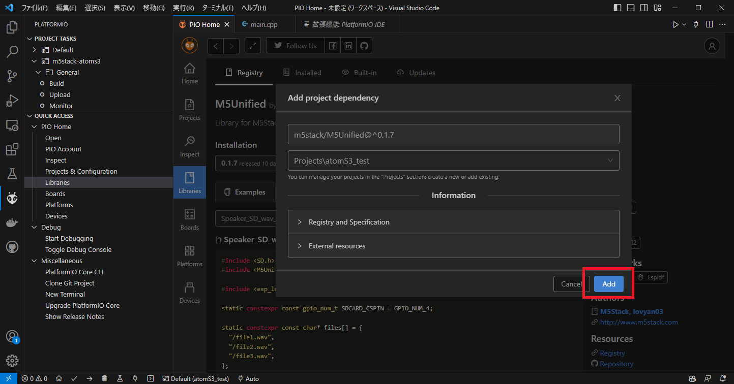 「Add」をクリックするとライブラリの導入が始まります。少し時間がかかるので待ちましょう。