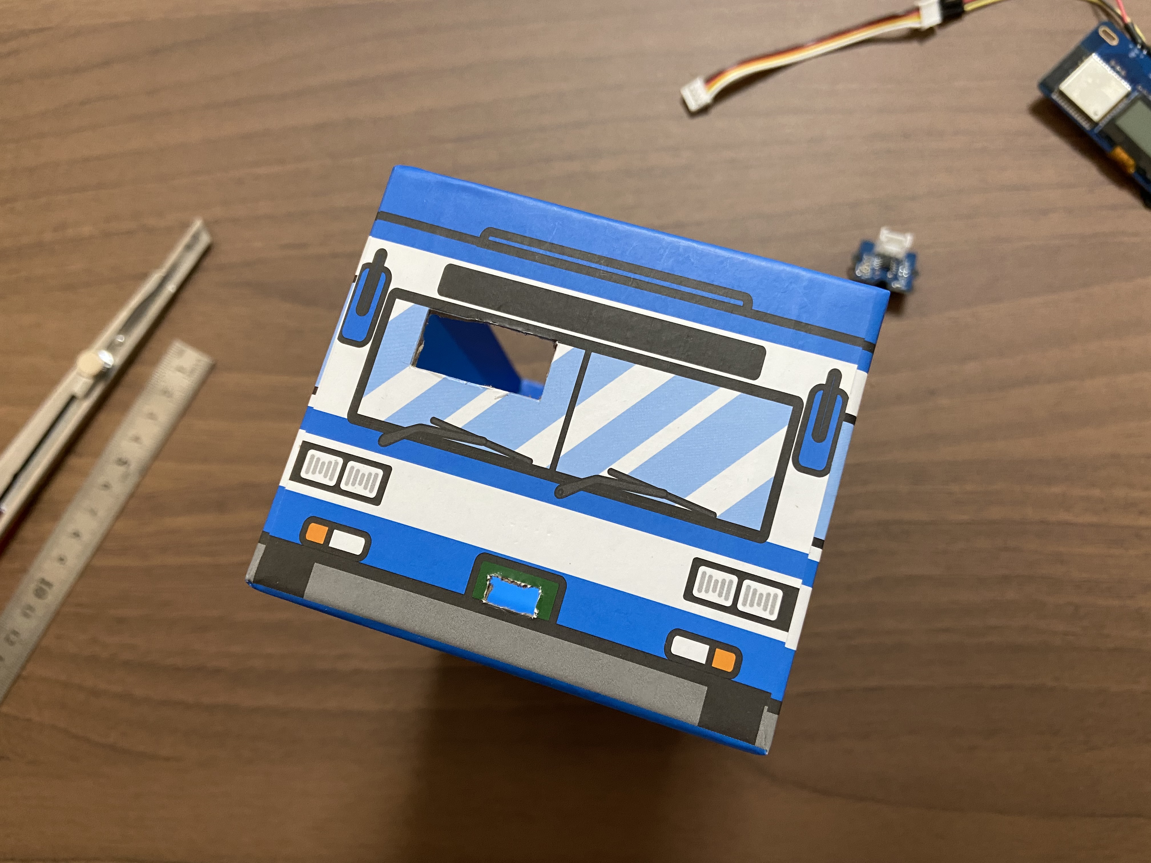 赤外線センサが椅子に座ったあたりの方向・距離で調整します