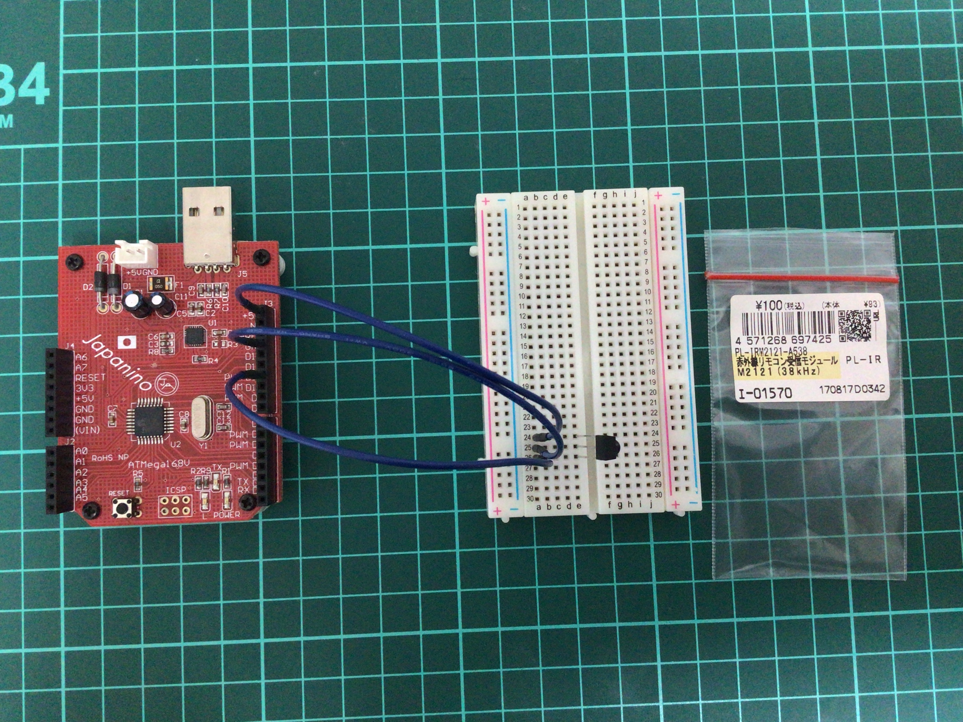 このように赤外線リモコン受信モジュール(38kHz)を結線します。解析プログラムにはGithubで公開されているIRライブラリを利用しました。