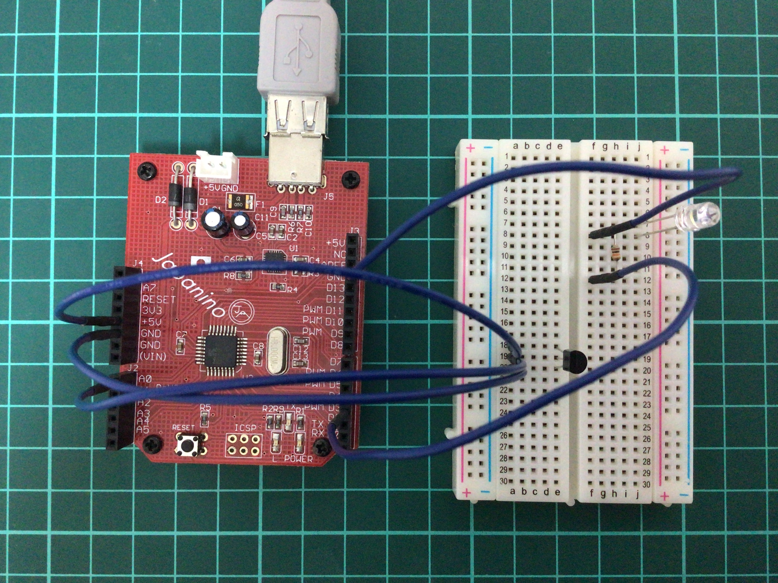 ブレッドボードの左側に温度センサ、右側に赤外線LEDを配置してあります。温度はA0で読み、LEDはD3で駆動しました。