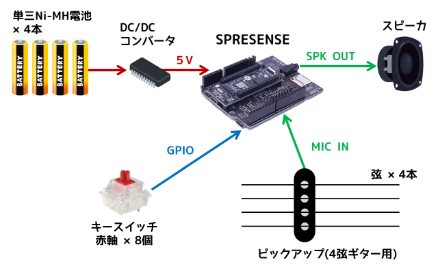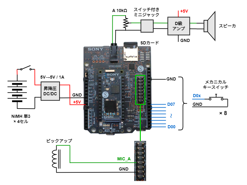 以上の仕様を実装するため、マイコンボードは SPRESENSE を使用しました。 SPRESENSEの拡張ボードは スピーカ出力端子やマイク端子、マイクロSDカードスロットを備えており、またオーディオ系や楽器作りのための豊富なライブラリとサンプルコードも用意されているためです。ピックアップはSPRESENSEのマイク端子に接続します。