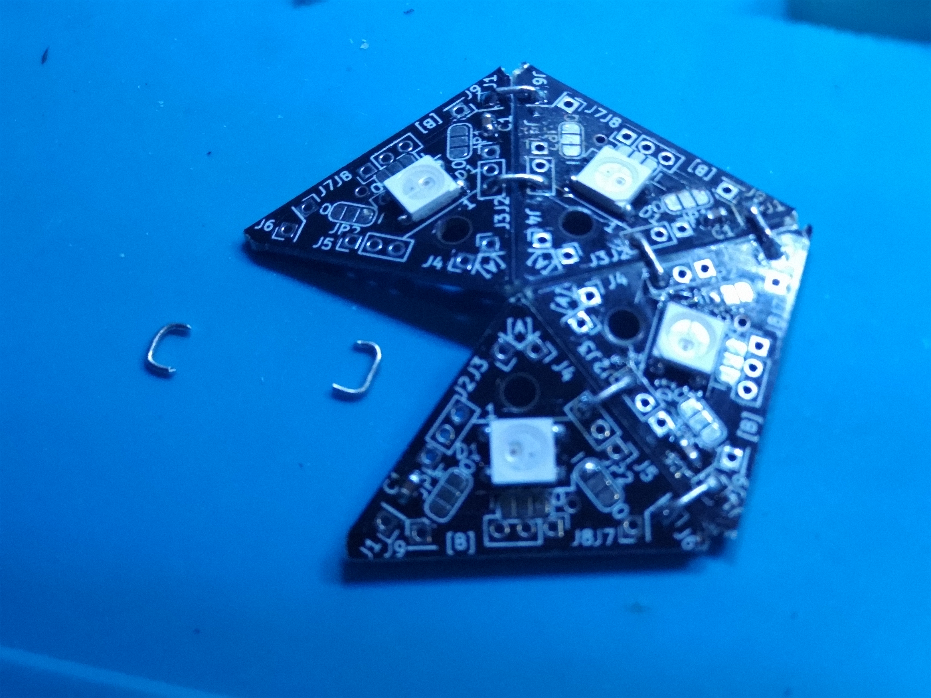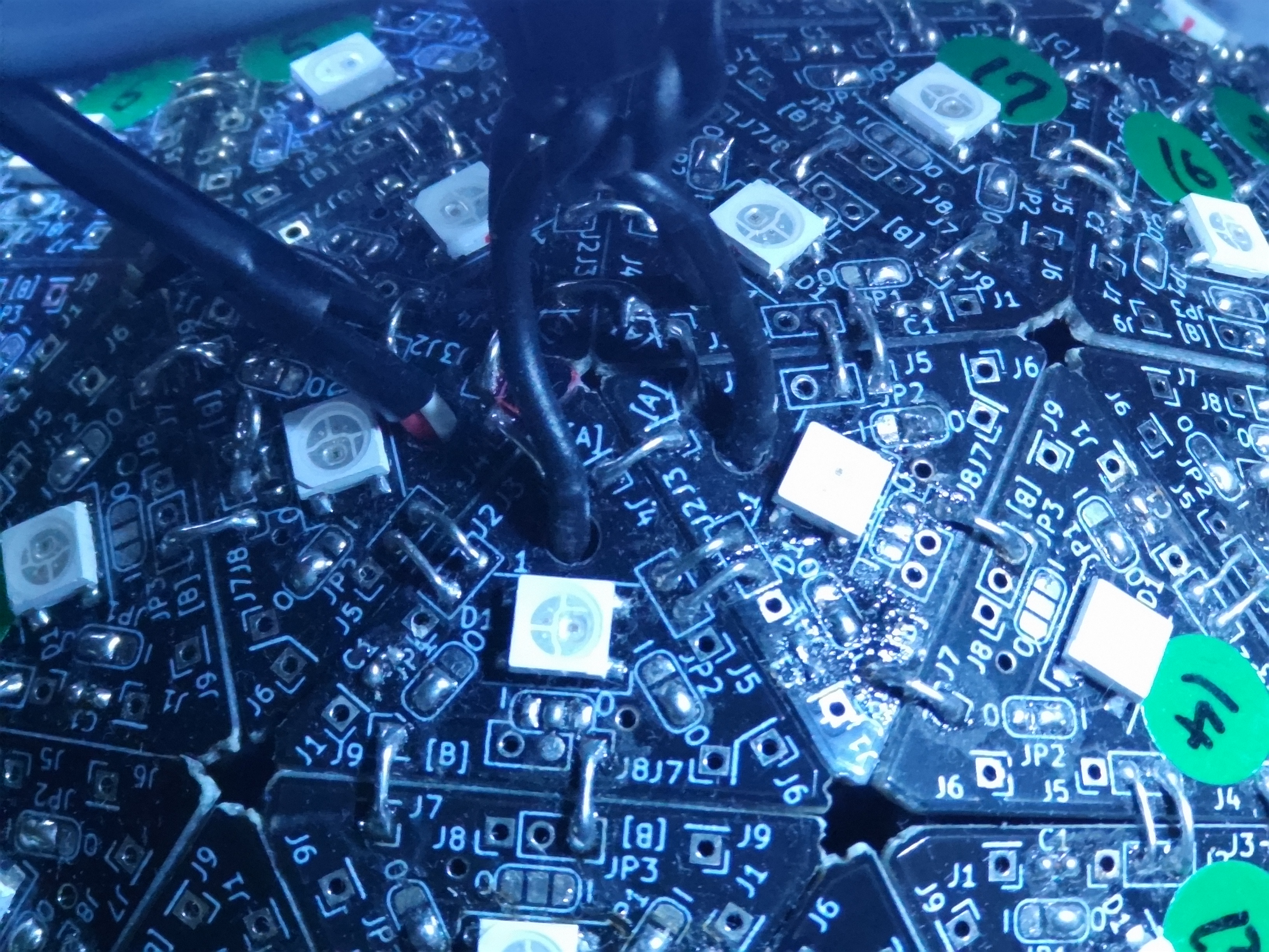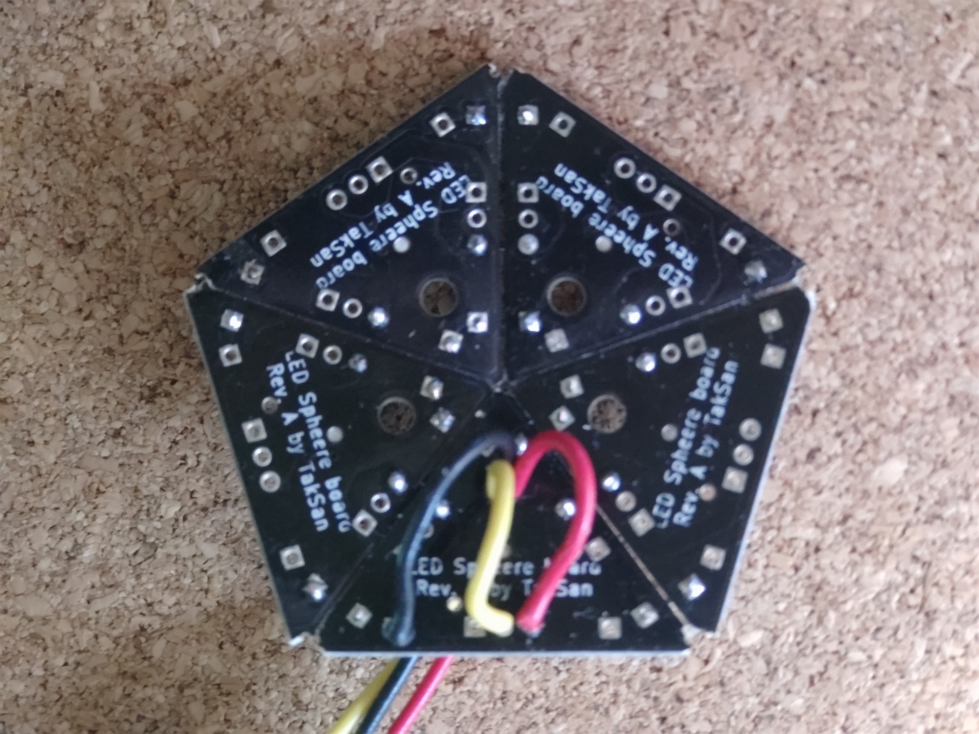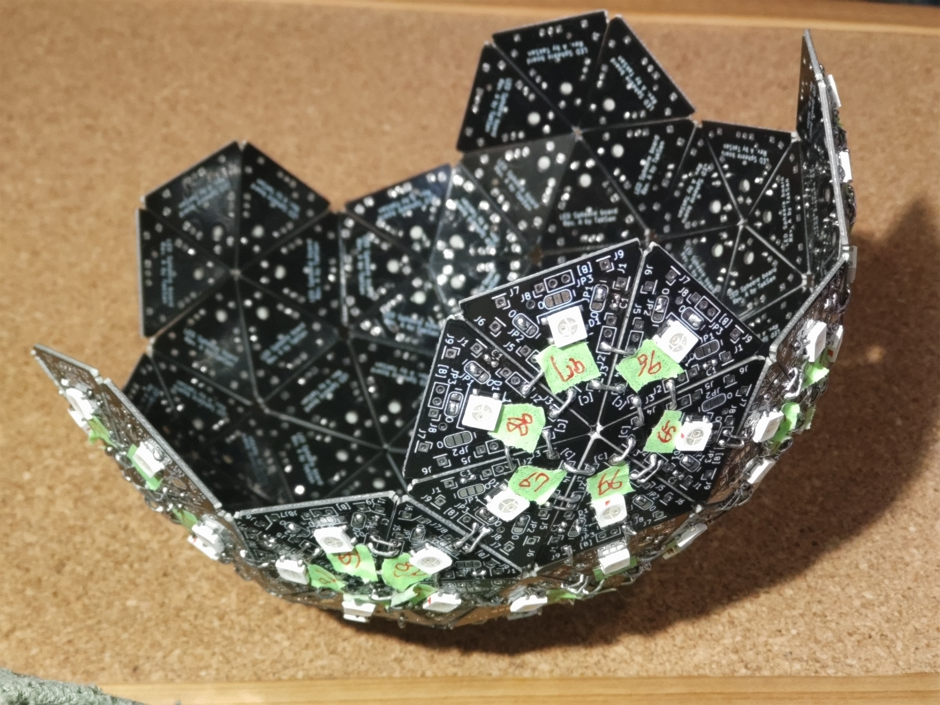 最後のパネルを繋いで球体にします。まずは信号線を繋いだ五角形の辺を繋ぎ、ショートチェックと点灯テストが完了後、他の辺を繋いでいくといいかと思います。