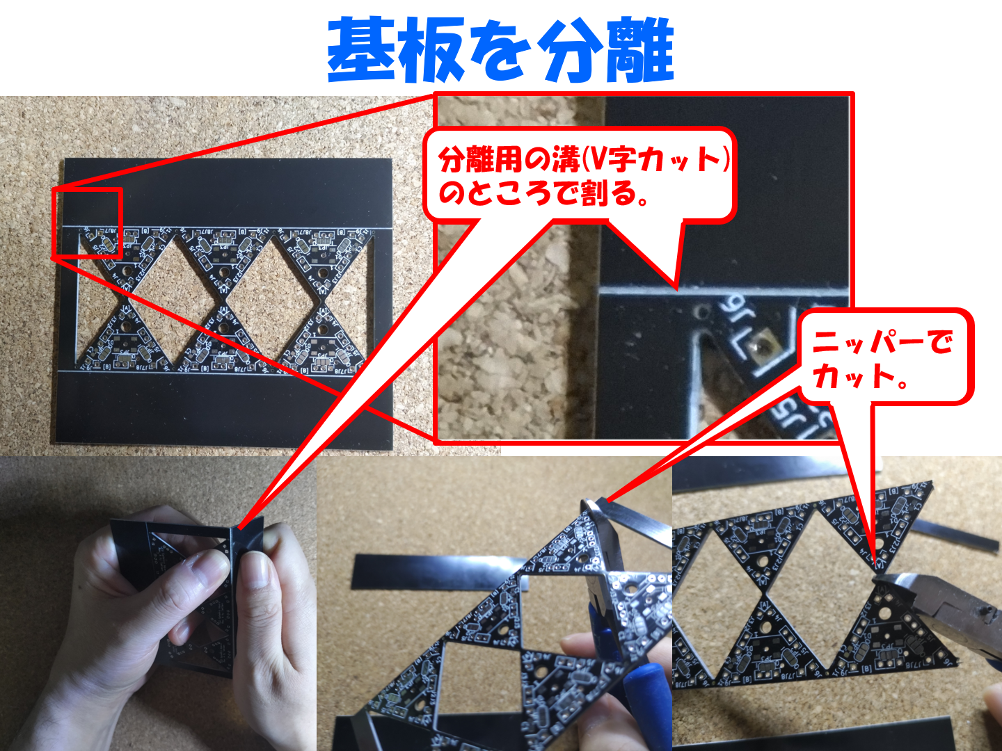 基板の上下はV字カットという分離用の溝が入っていますので、下の写真の様にその位置で割ります。その他の箇所は頂点同士でつながっているので、基板にダメージを与えない様にニッパーで切ります。