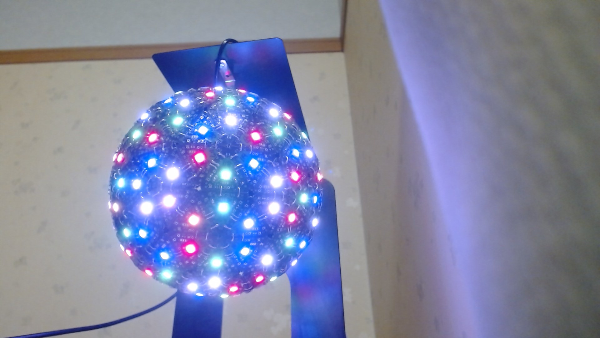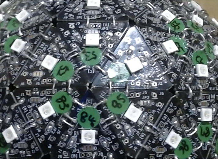 これは、フルカラーLED( Neopixel) を1個実装した三角形の基板を、180枚繋ぎ合わせて構成された球体LEDディスプレイです。以降 LED球体と書きます。
