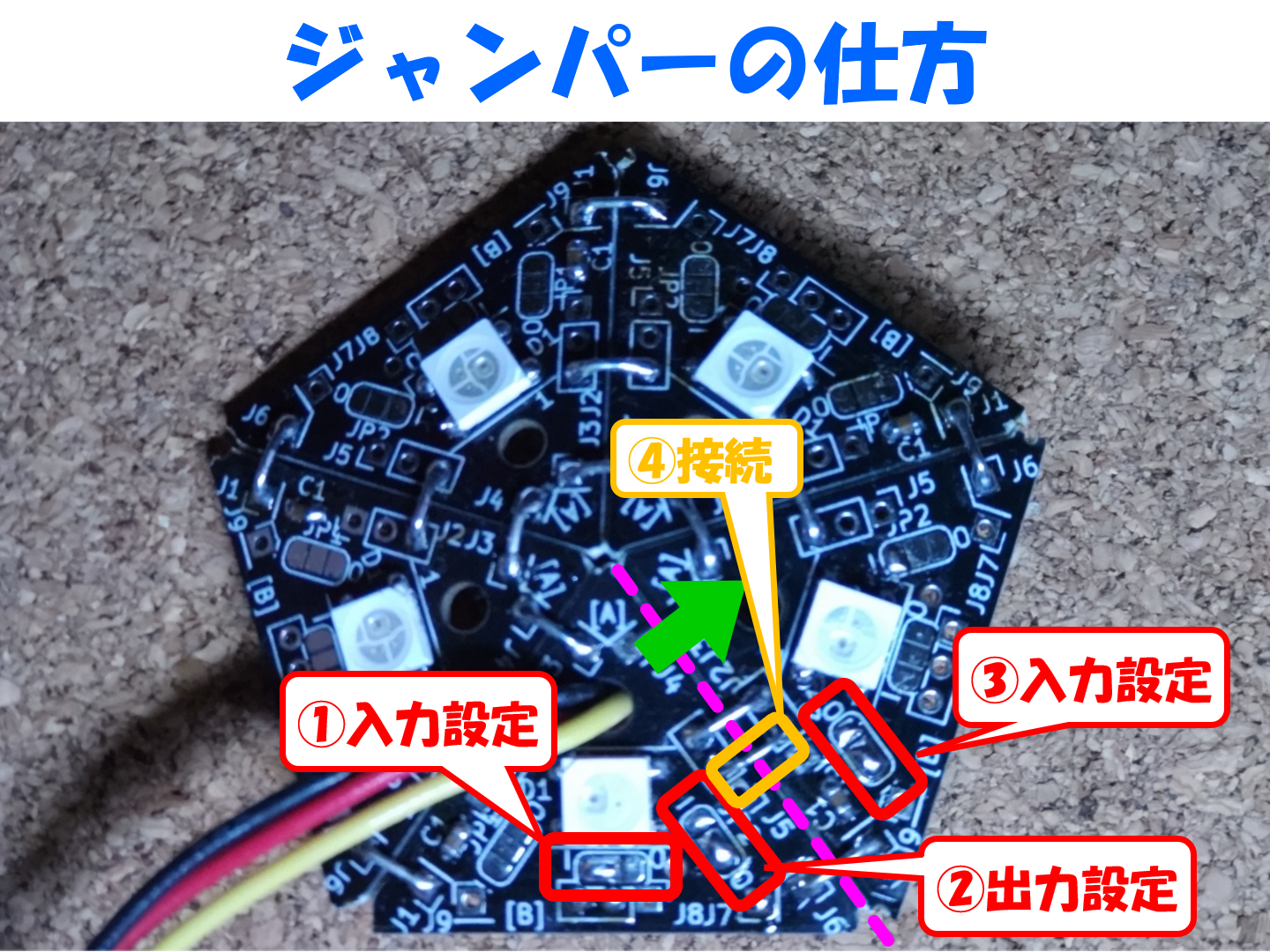 以降は、写真のピンク色の点線が基板の境界線とし信号の順番が緑色の矢印の方向の場合、この境界線を挟む前後で前を出力設定②、後を入力設定③にします。すなわち②の部分は "O"(OUT) 側をはんだでショートし、③の部分は "I" (IN) 側をはんだでショートします。その後④の様にピンク色の線をまたぐように、辺の中央にある信号線同士をジャンパーで接続します。この後は同じ要領で数珠繋ぎに180個を繋いでいくことになります。