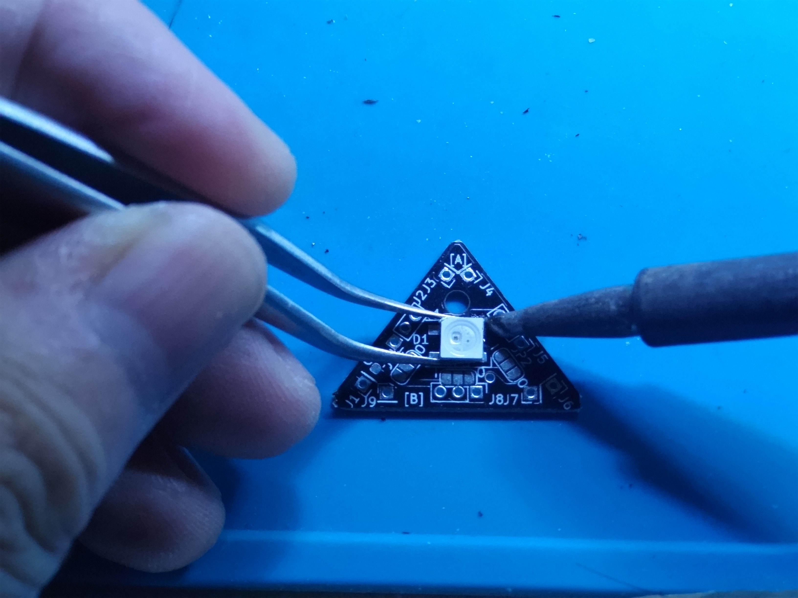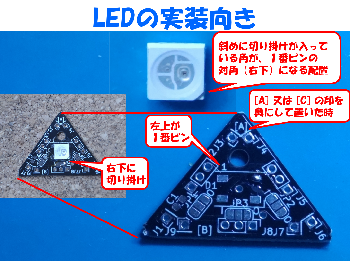 三角形の基板にまずは LED を実装します。LEDは正しい向きがありますので、写真の様に斜めの切り掛けが入っているほうを1番ピンと反対側(右下)に合わせてはんだ付けします。この写真の様に右上のパッドにだけはんだ付けをしておきます。