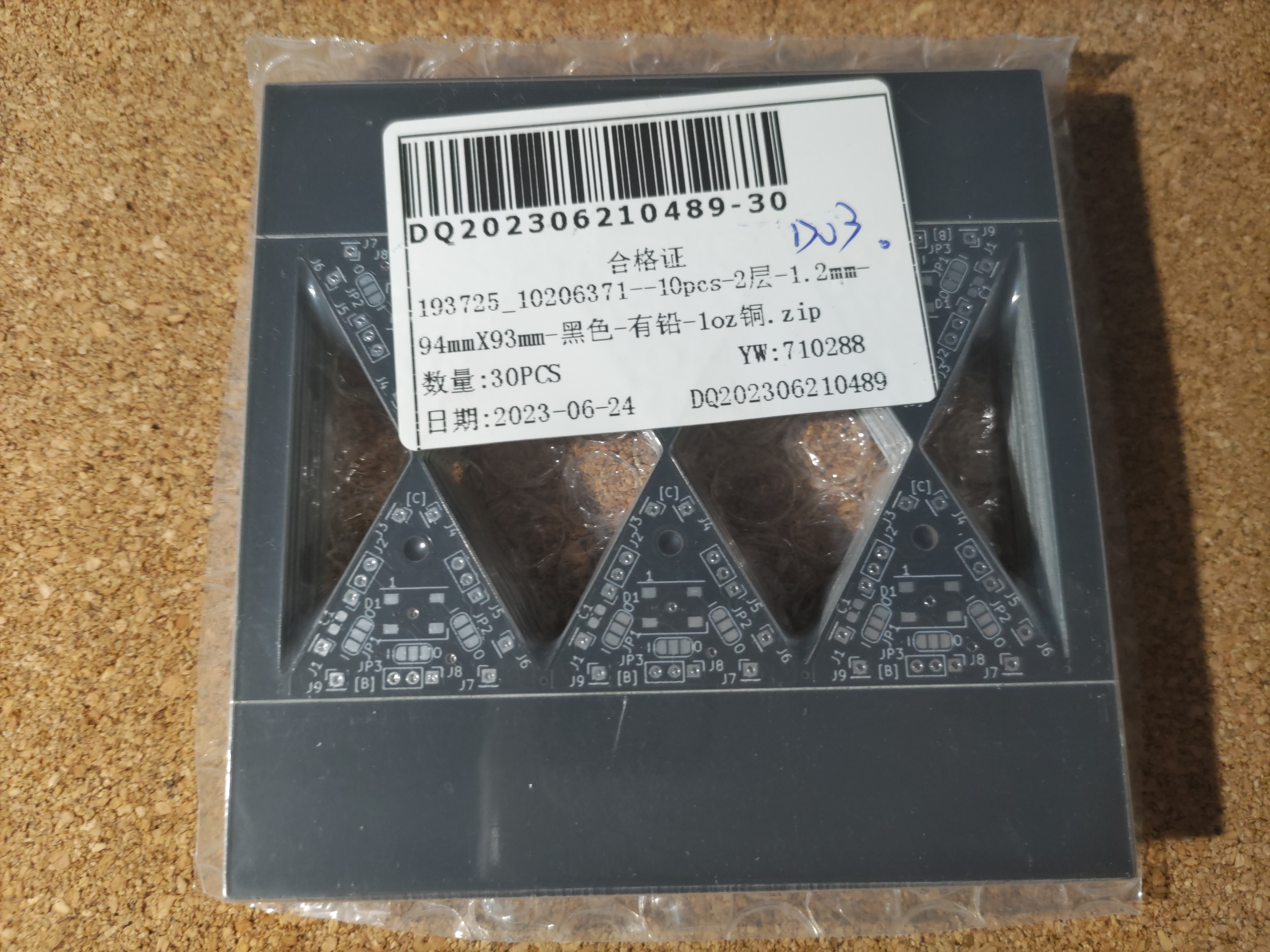 180枚中、Type-A 基板が 60枚、Type-C の基板が 120 枚必要となりますが、発注基板1枚に6枚の三角形基板がセットで面付けしています。ですのでType-A基板セットを10 枚、Type-C基板セットを20枚発注すると丁度良くなります。