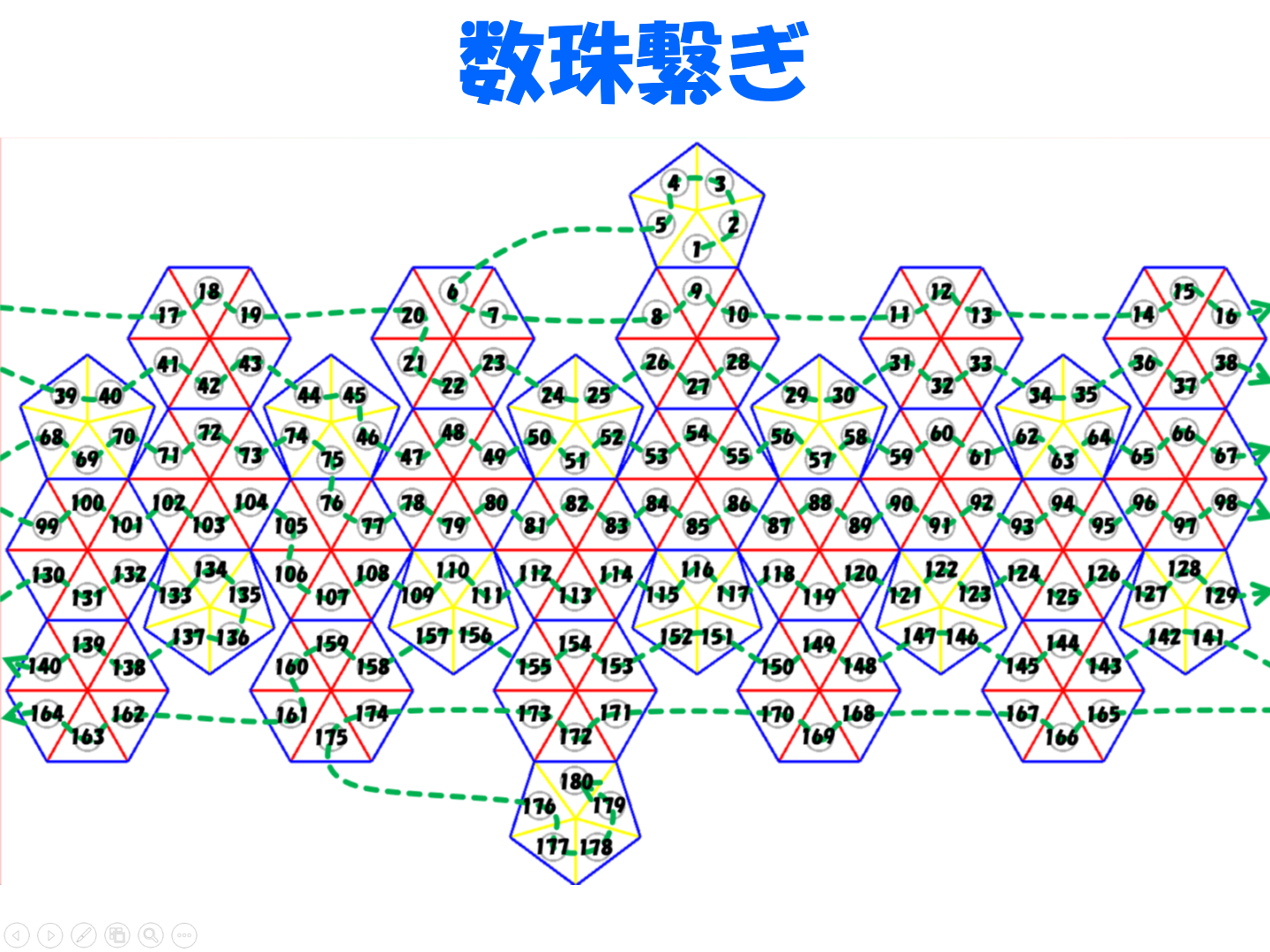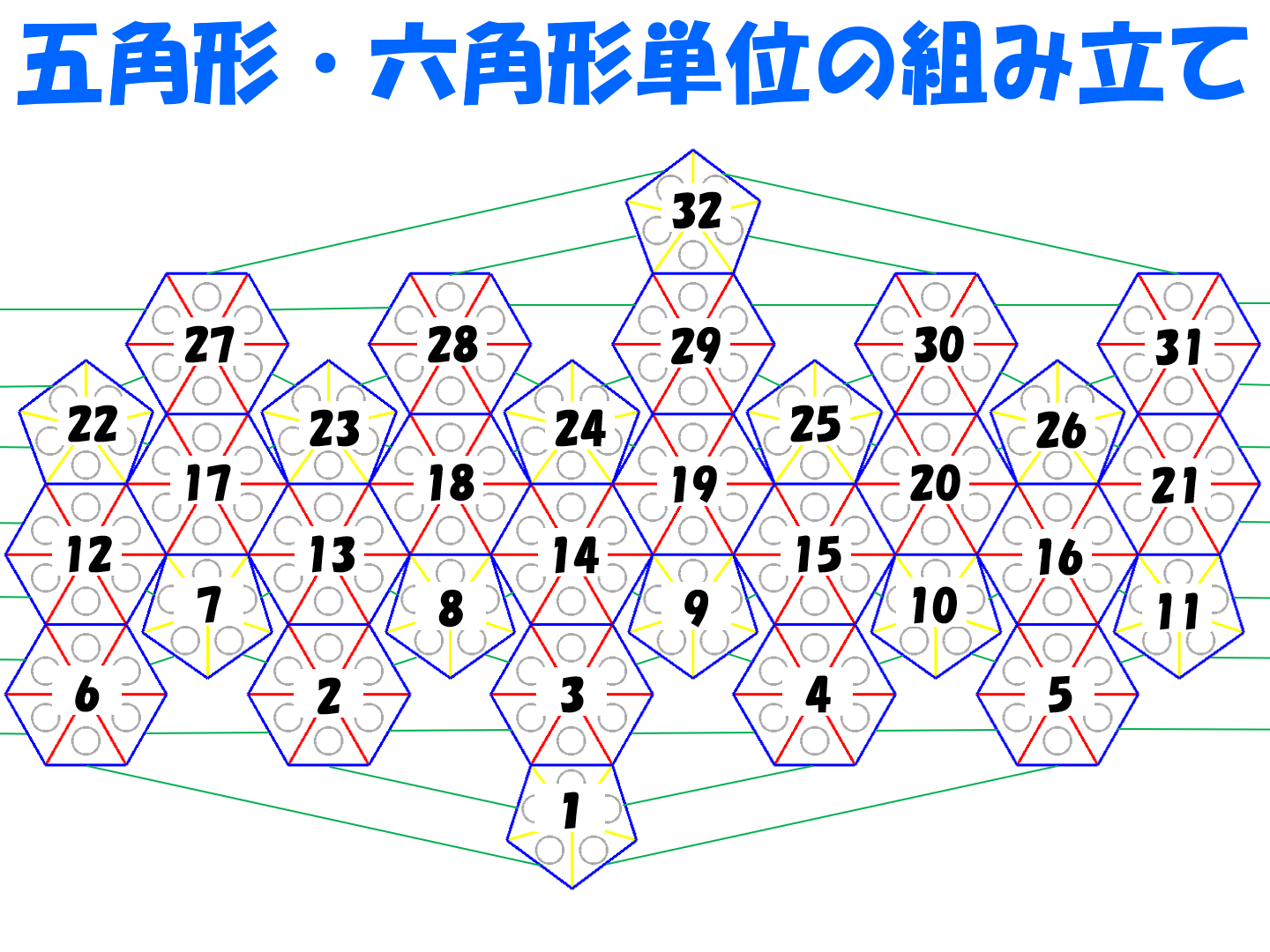 以下の展開図に、五角形・六角形単位での組み立て準備を示します。この設計図通りに振っている番号順に組み立てていくといいでしょう。展開図で見にくいので、接している辺同士は緑の線でつないでいます。